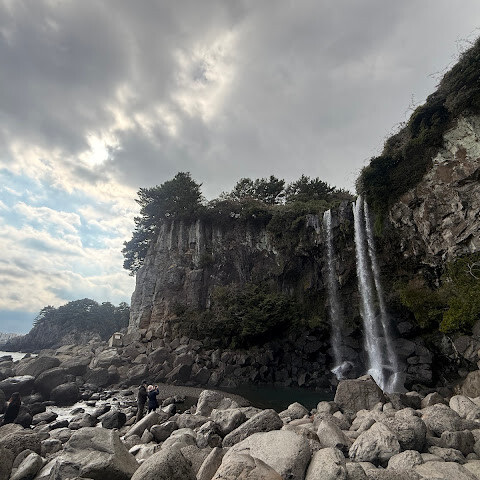 간단한 여정으로, 폭포는 주로 계단을 통해 바다로 직접 흘러내리며, 서귀포의 유명 관광 명소입니다.
