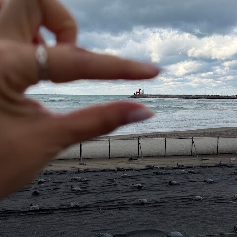 길게 뻗은 모래사장을 따라 산책하기 좋습니다. 바닷바람이 정말 상쾌합니다. 해변에서는 유명한 말 등대 두 채를 볼 수 있습니다. 재밌는 건, 사람이나 장비에 묻은 모래를 불어내거나 청소할 수 있는 송풍기가 있다는 것입니다.