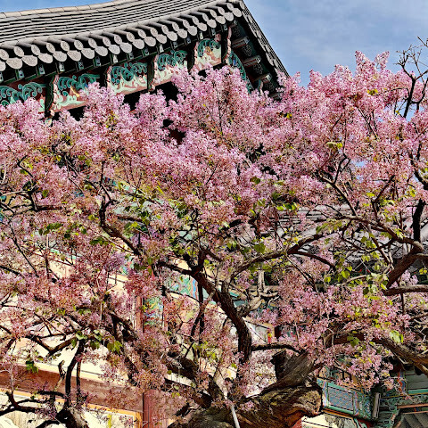 주차장에 있는 예쁜 분홍색 벚꽃나무와 부처님 오신 날에 반짝이는 형형색색의 등불은 정말 아름다운 광경을 자아냅니다 🤩