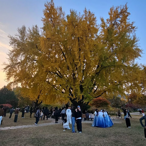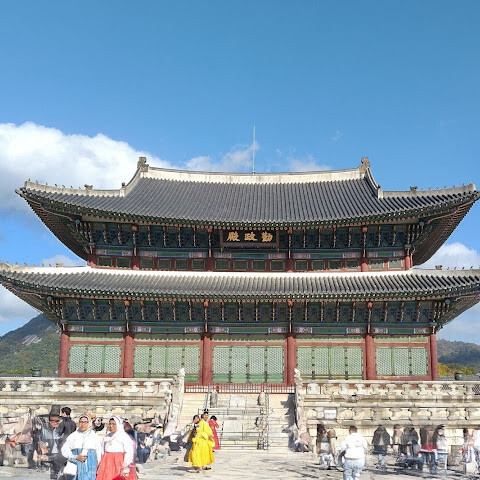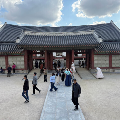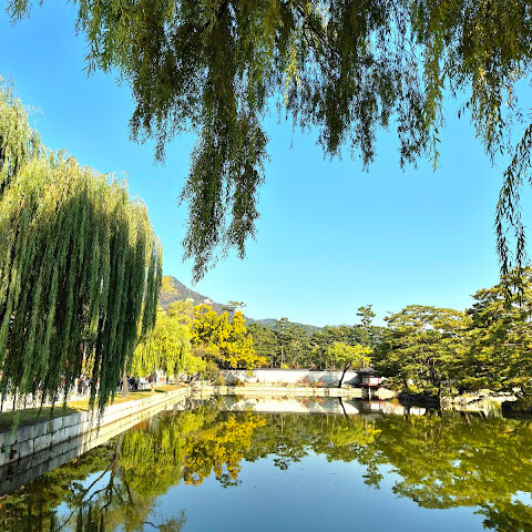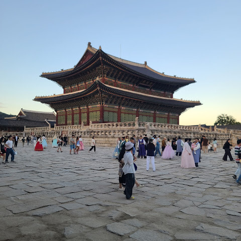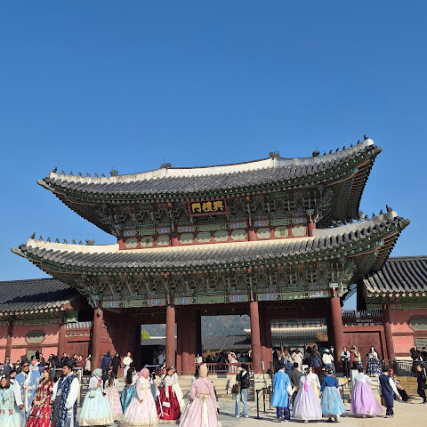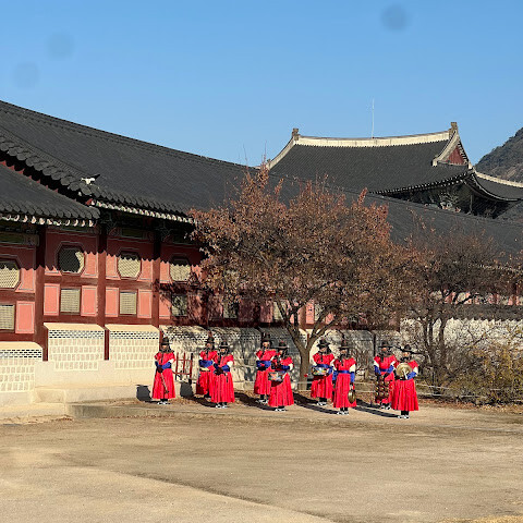 서울에서 가장 관광객이 많고 역사적인 장소예요. 아침 일찍 근위병 교대식을 보러 도착했는데, 꽤 붐볐어요. 많은 관광객들이 한복을 입고 있었는데, 한복을 대여하면 무료로 입장할 수 있었어요. 넓은 공간이라 건물 안으로 들어갈 수는 없었고, 정원만 돌아다녔어요. 아름다운 자연 경관이었고, 가을 단풍은 정말 아름다웠어요.