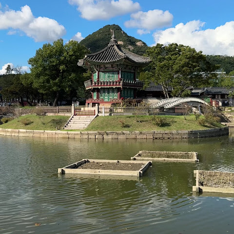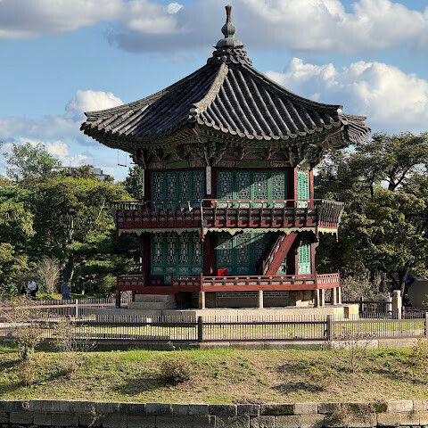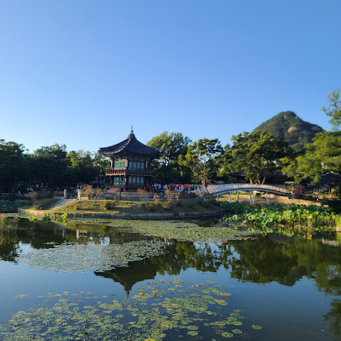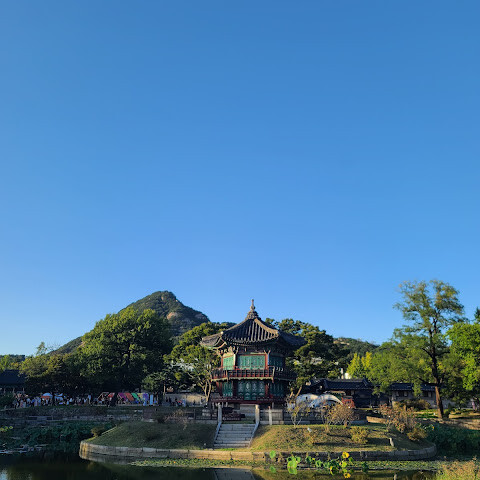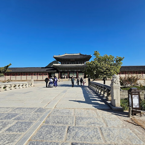 서울에서 가장 관광객이 많고 역사적인 장소예요. 아침 일찍 도착해서 근위병 교대식을 구경했는데, 꽤 붐볐어요. 많은 관광객들이 한복을 입고 있었는데, 한복을 대여하면 무료로 입장할 수 있었어요. 넓은 공간이라 건물 안으로 들어갈 수는 없었고, 정원만 돌아다녔어요. 아름다운 자연 경관이었고, 가을 단풍은 정말 아름다웠어요.