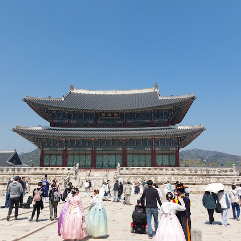 한복(한국 전통 의상)을 입고 사진 찍기에 아주 좋은 곳이에요. 경복궁은 규모가 매우 크지만 여름에는 꽤 더워요.