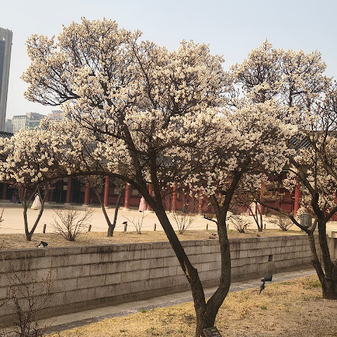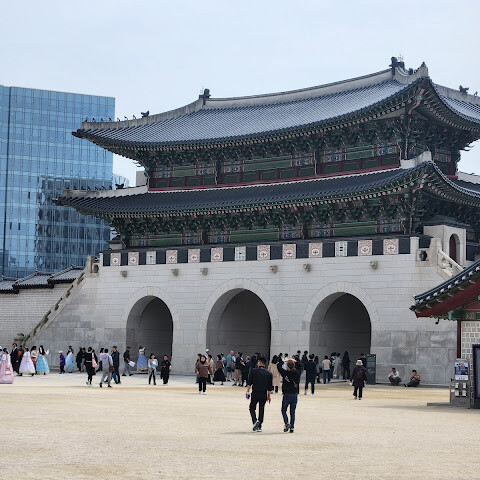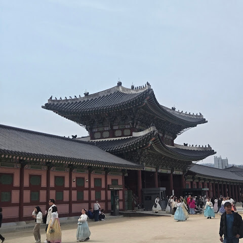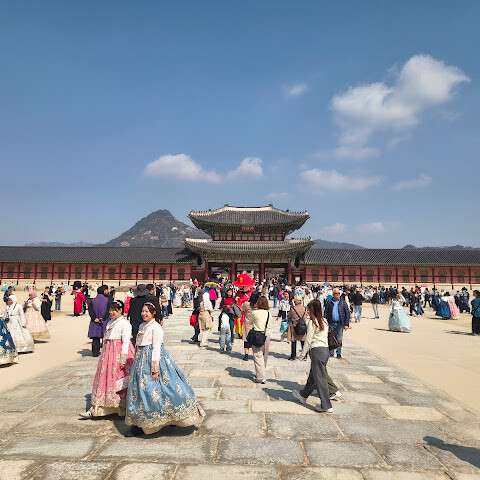 한복(한국 전통 의상)을 입고 사진 찍기에 아주 좋은 곳이에요. 경복궁은 규모가 매우 크지만 여름에는 꽤 더워요.