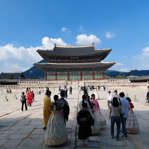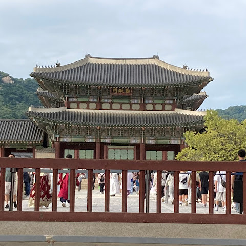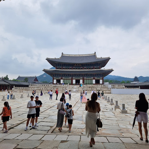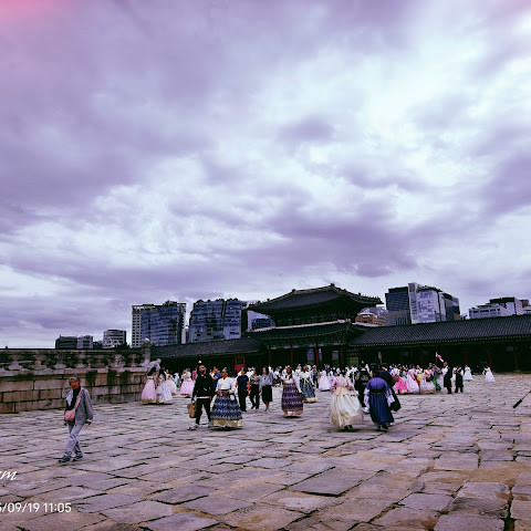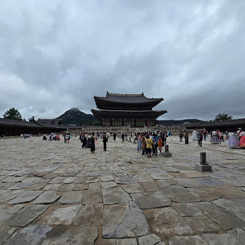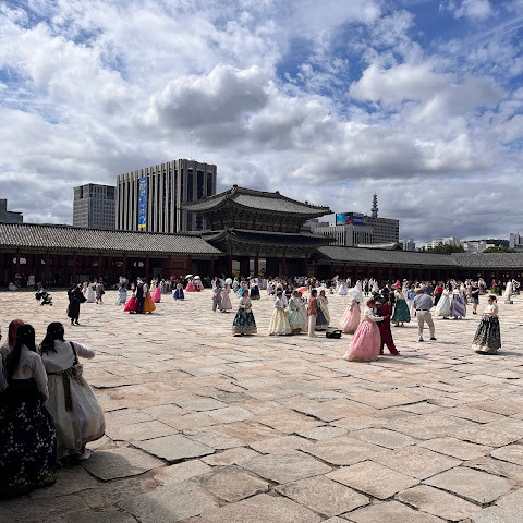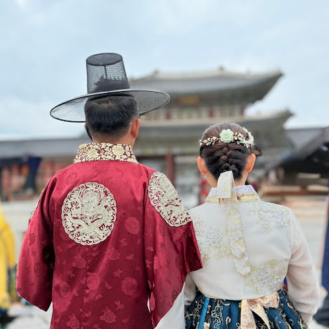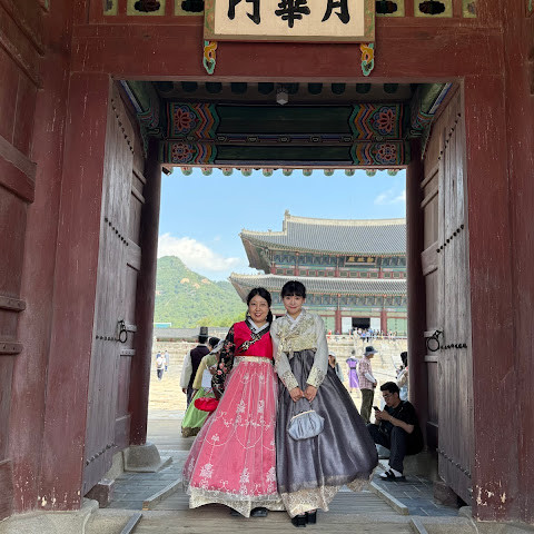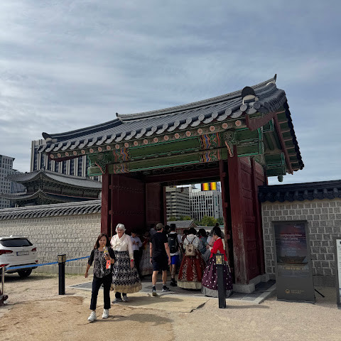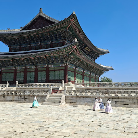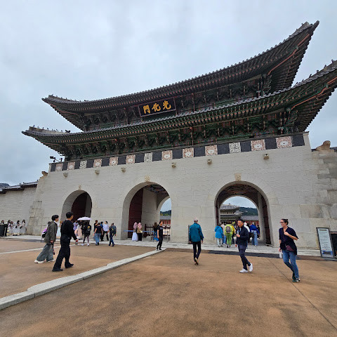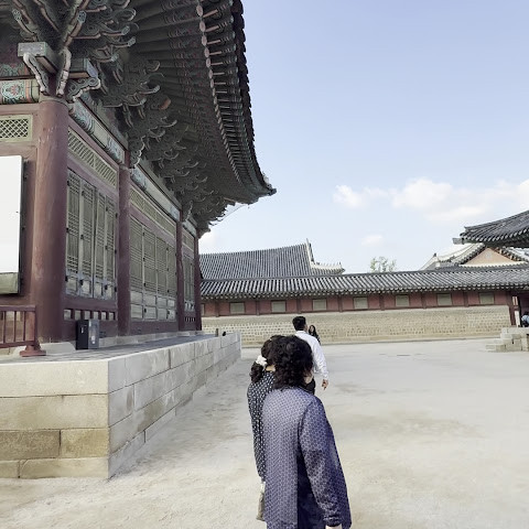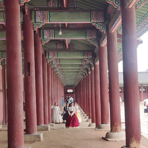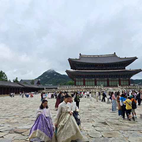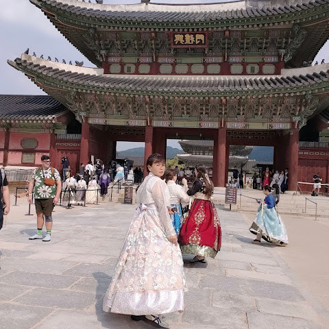 한복을 입으면 무료 입장은 물론, 한국 드라마 속 한복처럼 아름다운 사진을 찍고 잊지 못할 추억을 남길 수 있습니다. 한복을 대여하기 전에 원하는 색상과 스타일을 정해 경복궁을 비롯한 여러 궁궐에서 한복을 입고 관람하는 것을 추천합니다. 저희는 단체 관람객이었기에 바로 한복으로 갈아입고 관람에 나섰습니다. 경복궁 내부에는 화장실이 없다는 점을 유의하세요. 하지만 멋진 경험이었고 아름다운 사진을 남길 수 있었습니다. 흐린 날씨에는 사진 촬영 장비가 제대로 작동하지 않을 수 있습니다.