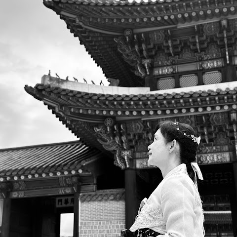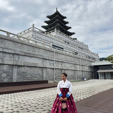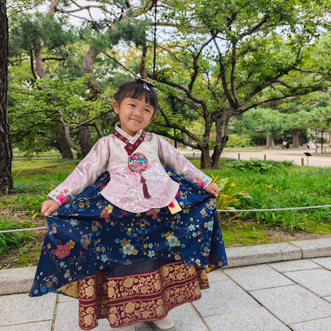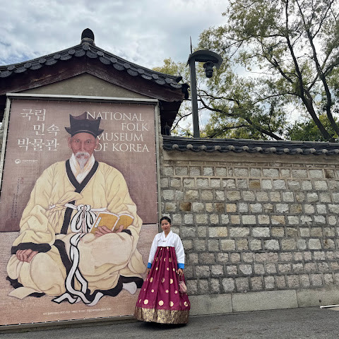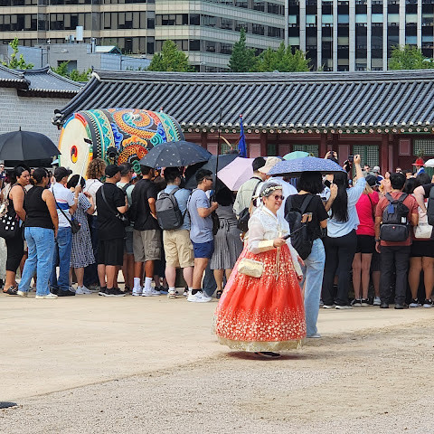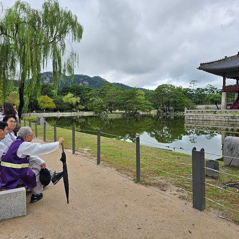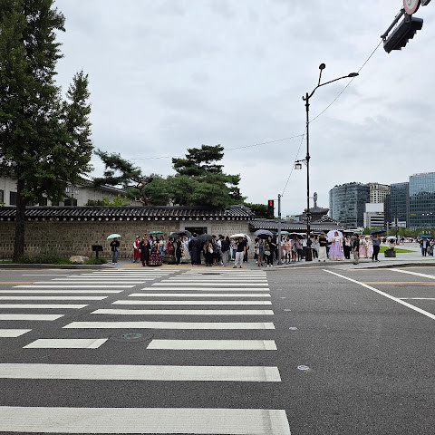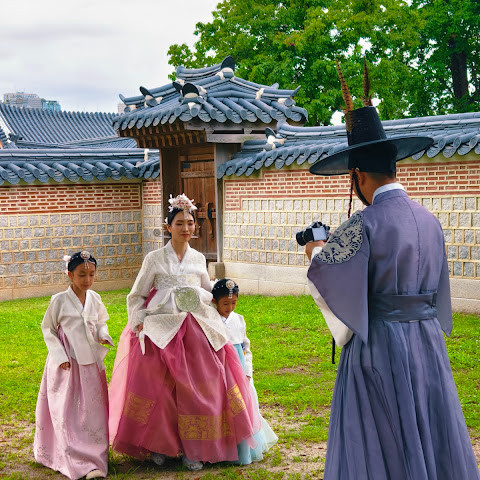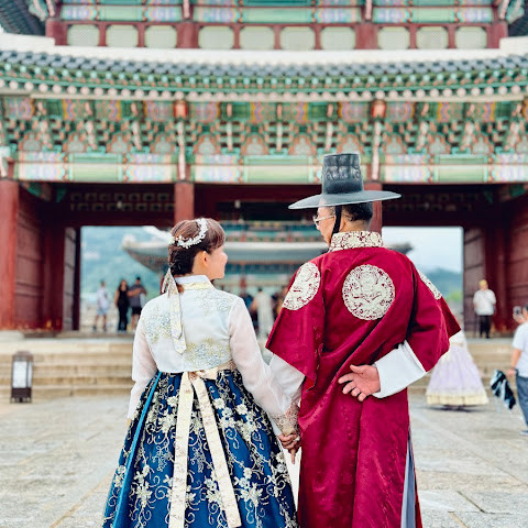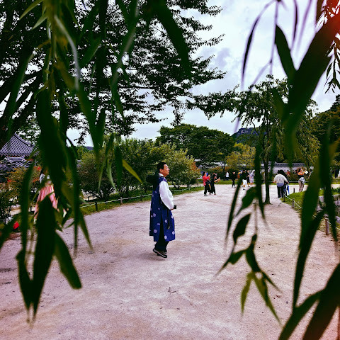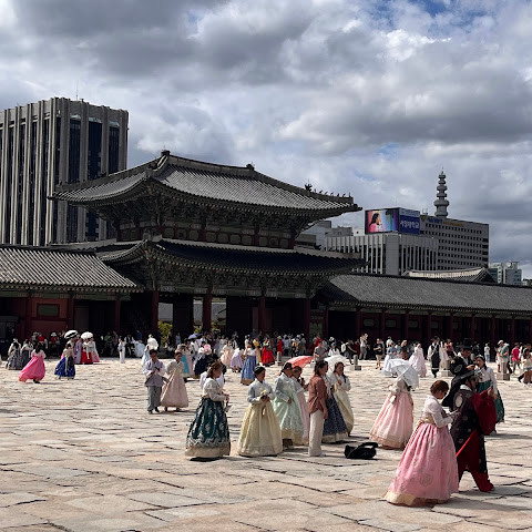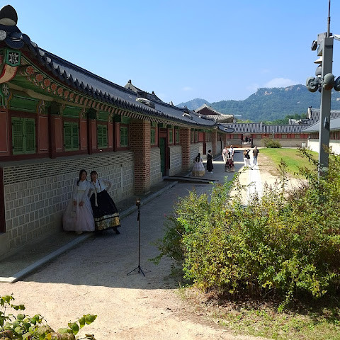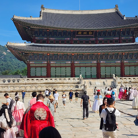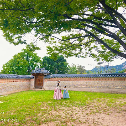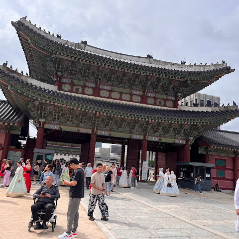 한복을 입으면 무료 입장은 물론, 한국 드라마 속 한복처럼 아름다운 사진을 찍고 잊지 못할 추억을 남길 수 있습니다. 한복을 대여하기 전에 원하는 색상과 스타일을 정해 경복궁을 비롯한 여러 궁궐에서 한복을 입고 관람하는 것을 추천합니다. 저희는 단체 관람객이었기에 바로 한복으로 갈아입고 관람에 나섰습니다. 경복궁 내부에는 화장실이 없다는 점을 유의하세요. 하지만 멋진 경험이었고 아름다운 사진을 남길 수 있었습니다. 흐린 날씨에는 사진 촬영 장비가 제대로 작동하지 않을 수 있습니다.