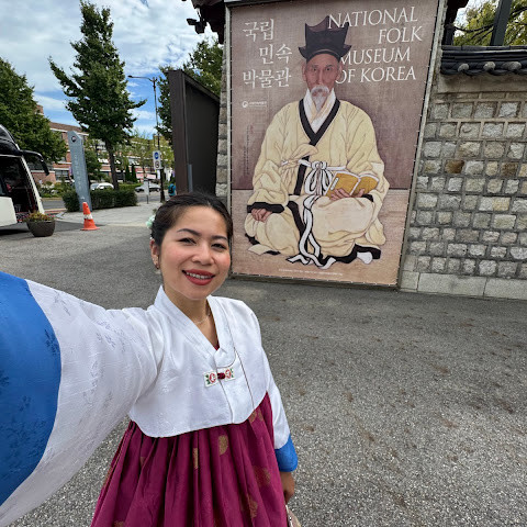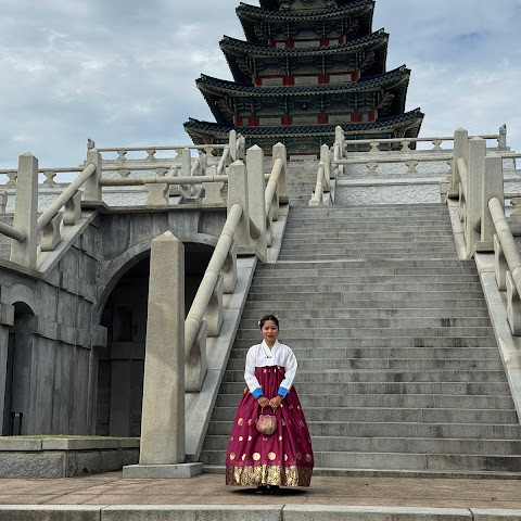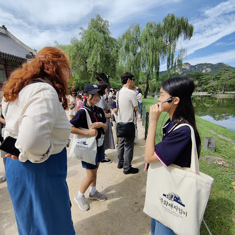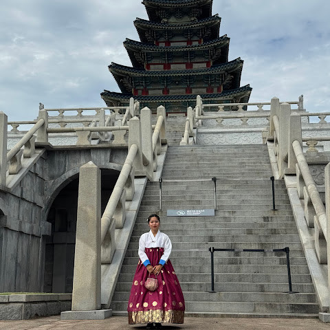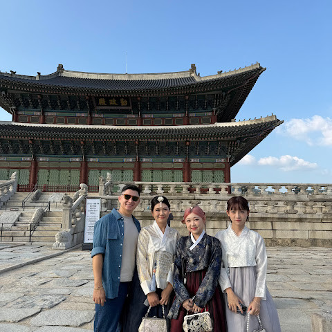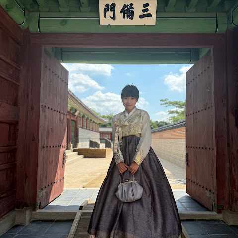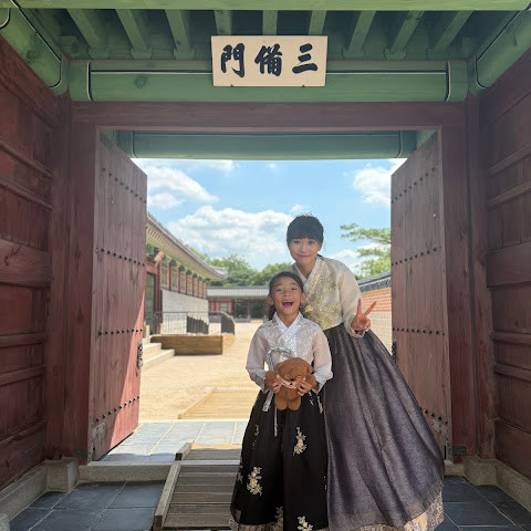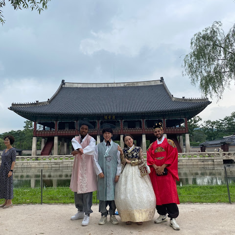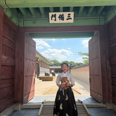저는 항상 한복을 입고 경복궁에서 사진을 찍어왔어요. 정말 재밌고 신나는 경험이었어요. 다행히 오늘은 햇볕이 너무 강하지 않아서 좋았고, 개인 사진과 단체 사진 모두 정말 멋졌어요.