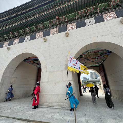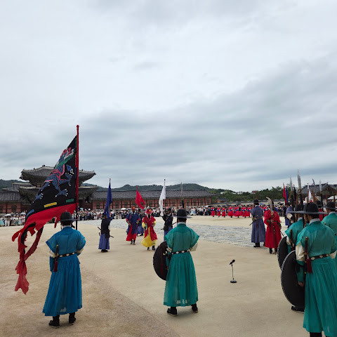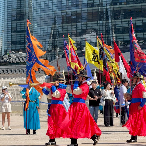 경복궁은 정말 웅장해요. 수문장 교대식은 매우 화려하고 정교해요.