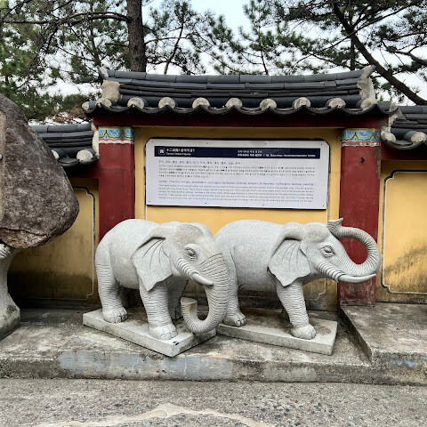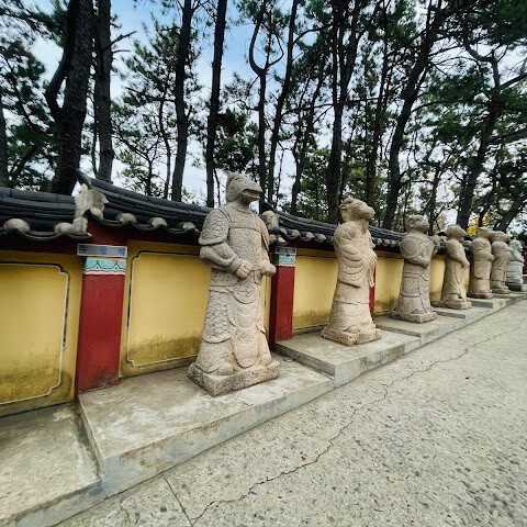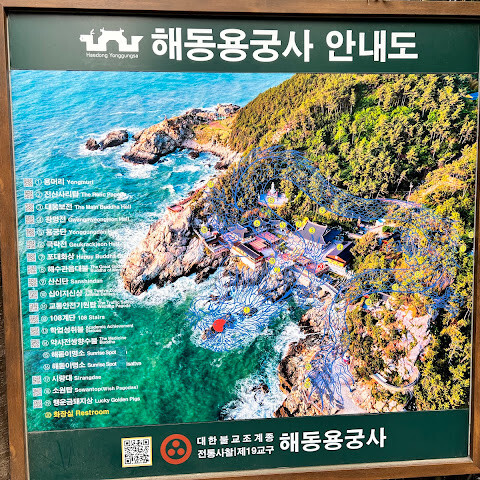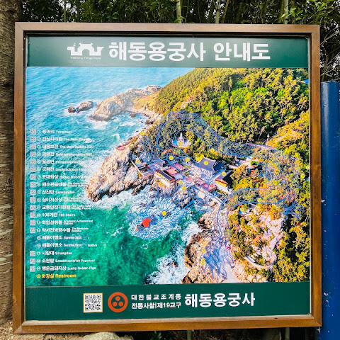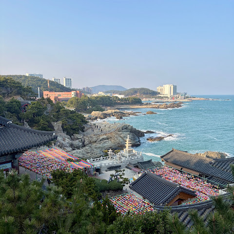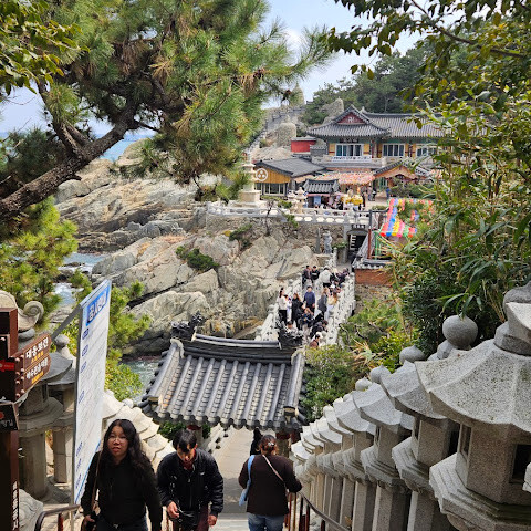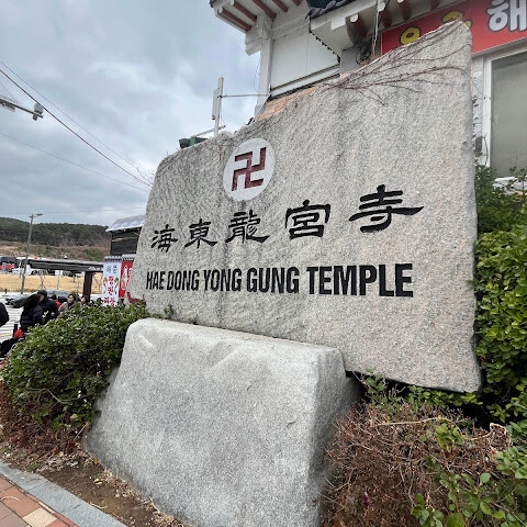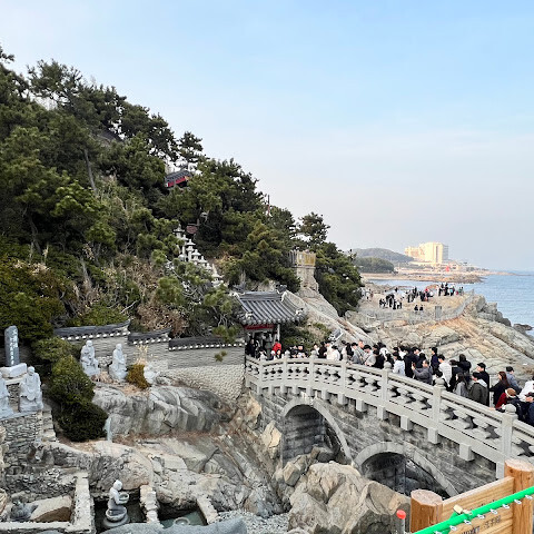 부산 시내에서 시내버스를 타고 바닷가에 위치한 아름다운 불교 사찰인 해동용궁사에 갔습니다. 사찰은 바다를 마주한 바위 절벽 위에 자리 잡고 있어 한국에서 가장 아름다운 사찰 중 하나로 꼽힙니다.