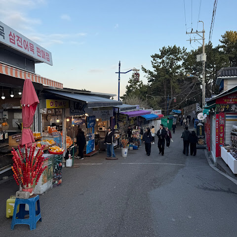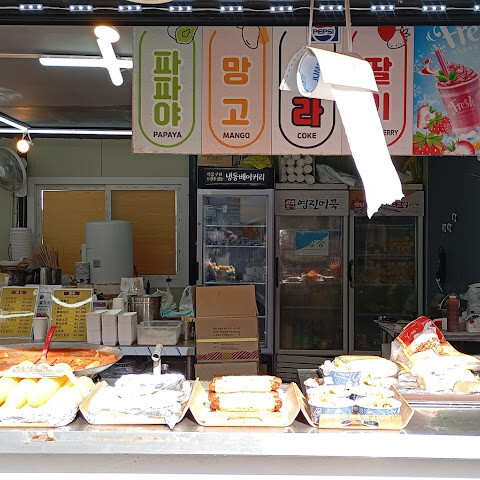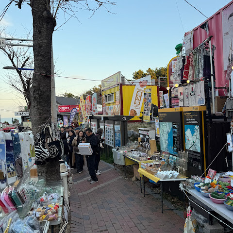 입구에는 노점상, 음식 카트, 편의점이 있었어요. 저는 어묵을 사 먹었는데 꽤 맛있었어요.