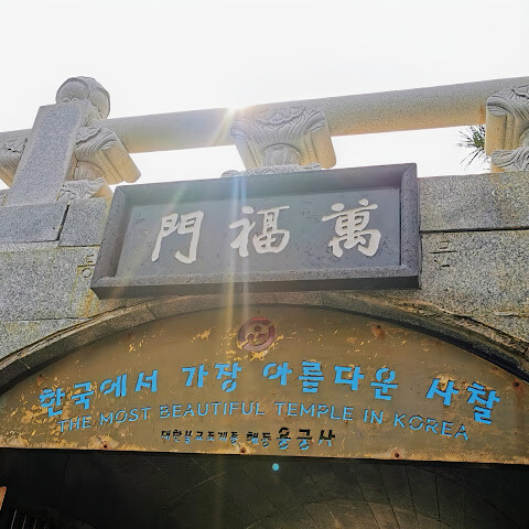 해안을 따라 세워진 특이한 사원. 일본의 사원과 비교하면 색채가 화려한 인상이었습니다. 경내에는 일주할 수 있는 루트가 있어 도중의 다리로부터 동전을 던져 운 시험 같은 체험도 할 수 있습니다. 주변에는 포장마차가 늘어서 많은 한국인 관광객으로 붐비고 있습니다.