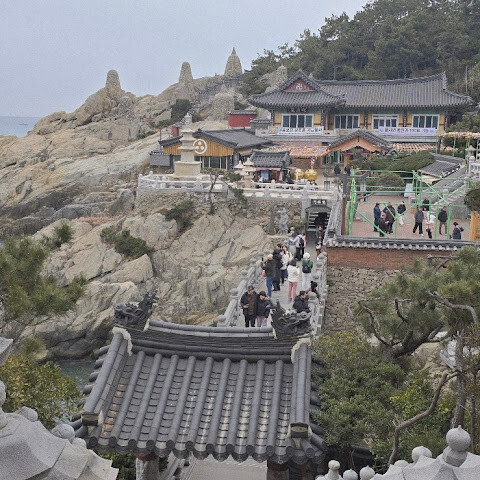 대부분의 한국 사찰은 고요한 산속 깊은 곳에 자리 잡고 있지만, 용궁사는 그와는 달리 거친 동해의 바위투성이 해안가에 당당히 서 있습니다. '부단문'이라는 글자가 새겨진 돌문을 지나 근심을 없애는 것을 상징하는 108계단을 내려가자, 목북 소리뿐 아니라 바위에 부딪히는 파도 소리가 울려 퍼졌습니다. 그 순간, 마치 신의 세계에 들어온 듯한 기분이 들었습니다.