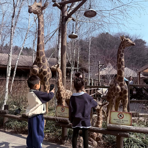 2026년 3월 24일. 에버랜드 첫 방문. 평일이었는데도 10개월 전부터 계획했던 여행이 마침 초식동물들을 가까이에서 볼 수 있는 '로즈 밸리' 특별전이 한 달 동안 열리는 기간과 겹쳐서 정말 놀랐어요. 사람이 엄청 많았고, 로즈 밸리는 입장 시 줄을 서야 하는 새로운 시스템으로 바뀌어 있었죠. (온 가족 티켓을 연동하는 앱 사용법을 몰랐던 터라) 운이 좋았다고 생각했어요. 개장하자마자 로즈 밸리로 달려갔는데, 질서도 잘 잡혀 있었고 직원분들도 정말 친절했어요. 심지어 나갈 때 브로치까지 선물로 주셨답니다. 로즈 밸리를 구경하고 나니 이미 긴 줄이 서 있었고, 부모님들과 아이들이 가득했어요. 기린들이 키 측정 구역에 얌전히 서 있어 주는 모습도 너무 재밌었어요.