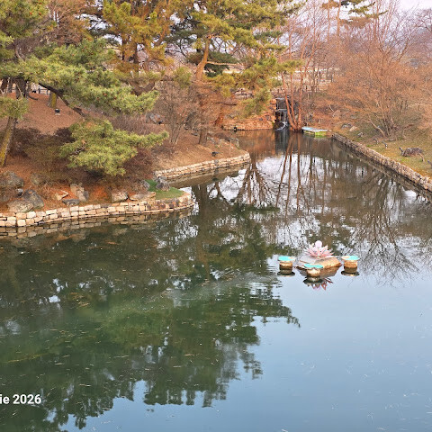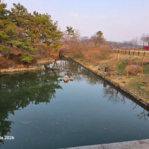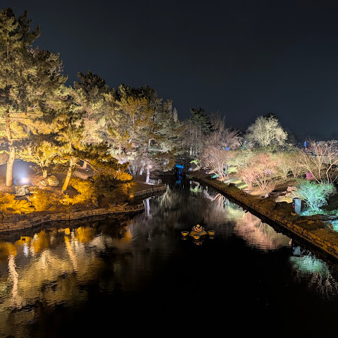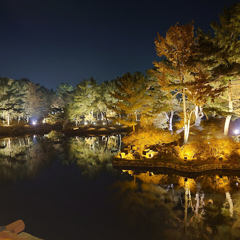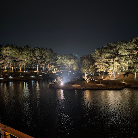 입장료는 3,000원이고 기념품 가게도 있어요. 밤에 갔더니 물에 비친 나무와 건물들의 모습이 아름다웠습니다. 주변에 산책로도 있지만 날씨가 쌀쌀해서 이용하지는 못했어요. 공원 안에 화장실과 기념품 가게가 있습니다.