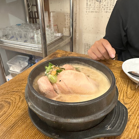 남편과 함께 유명한 삼계탕을 먹으러 왔습니다. 전반적으로 맛은 훌륭했고, 특히 인삼 향이 진하게 느껴졌습니다. 여러 곳에서 삼계탕을 먹어봤지만, 어떤 곳은 인삼 향이 이렇게 강하게 느껴지지 않았거든요. 겨울에 먹기 딱 좋은 곳입니다. 한국의 여름은 매우 덥고 탈수 증상이 심할 수 있기 때문에, 현지인들은 여름에도 체력 보충을 위해 삼계탕을 즐겨 먹는다고 합니다.