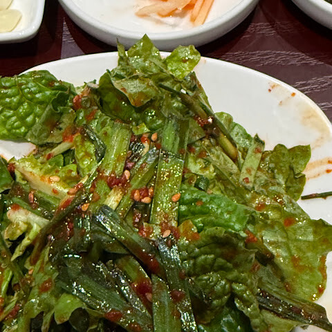 곁들여진 양상추는 양념이 잘 배어 있고 맵지 않아서 바비큐 고기와 딱 어울렸어요!