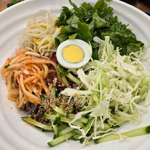 환상적인 곳! 한국식 냉메밀국수가 정말 맛있었어요. 기본은 하지만 맛은 훌륭했어요. 저희가 갔을 때 밖에 줄이 서 있었어요 (바깥 벤치에서 기다렸던 걸까요?) 네, 맞아요. 기다린 건 좋은 징조였어요. 메일을 정말 맛있게 먹었어요. 추천