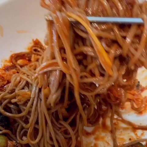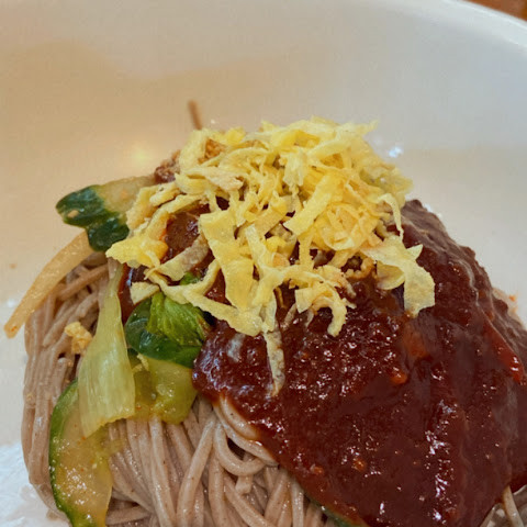 주문하고 선불로 계산합니다. 메밀이라고써있는건 메밀이고, 아닌거는 우동면으로 조리합니다. 메뉴 4가지고, 가격은 ALL 10000원이에요. 메밀이래서 혈당스파이크 안 올 줄 알았는데 먹고 졸려 죽는줄..... 비빔메밀은 양념베이스가 고추장볶음입니다! 자극적이지않은 맛이라 좋았어요!