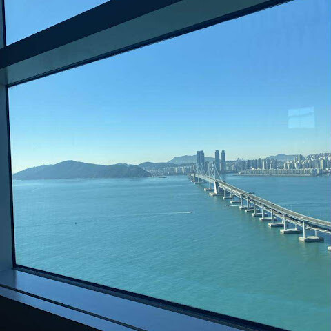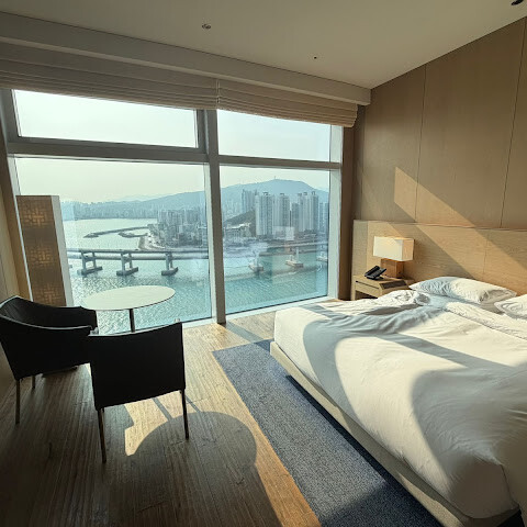 이 숙소는 5성급 호텔이지만, 처음에 배정받은 방은 벽에 얼룩이 있고 다른 청결 문제도 있었습니다. 다행히 게스트 서비스 담당 케빈이 단점을 인정하고 다른 방으로 옮겨 주었습니다. 부산 최고의 전망입니다.