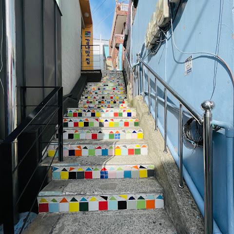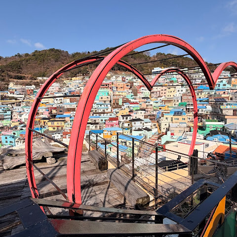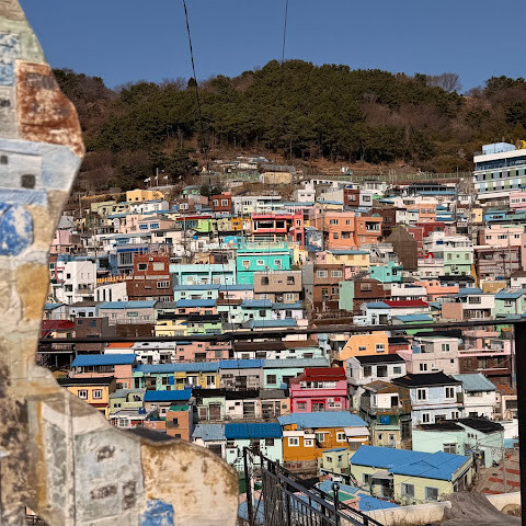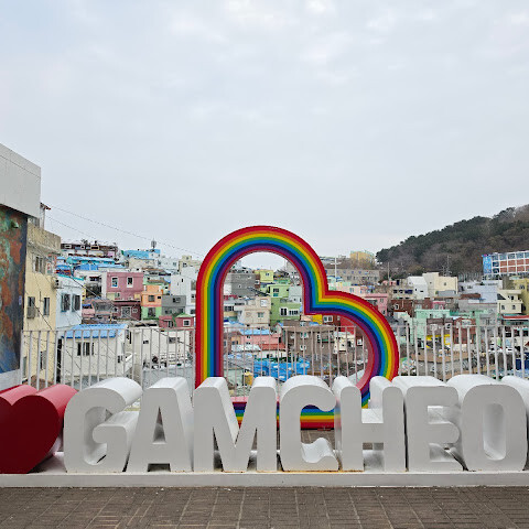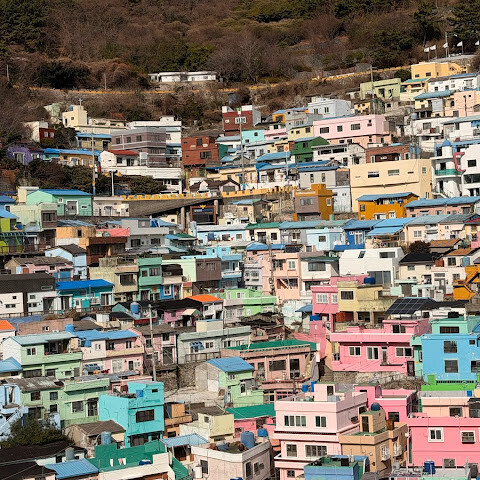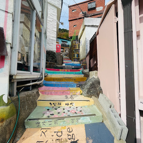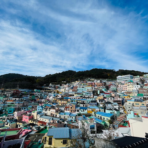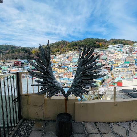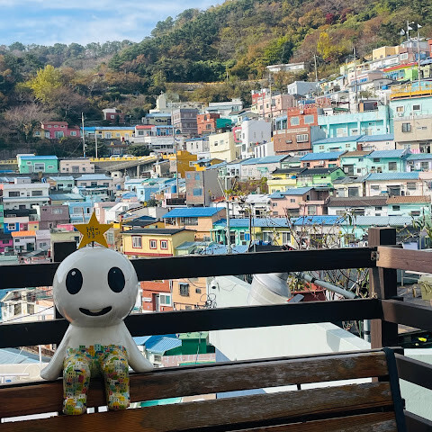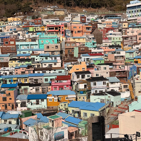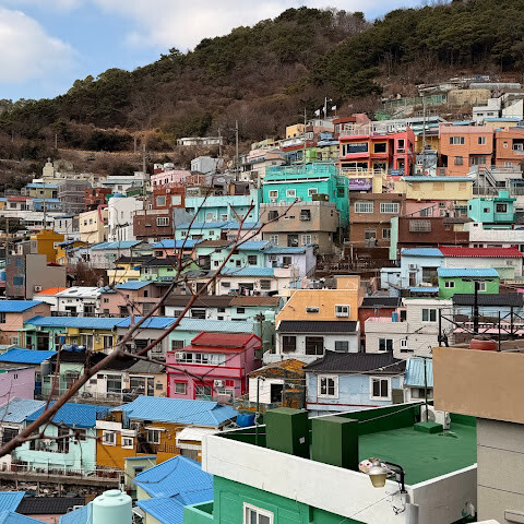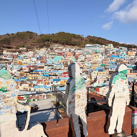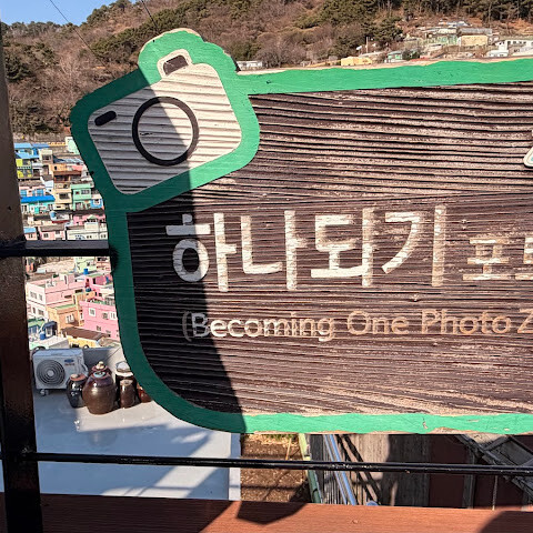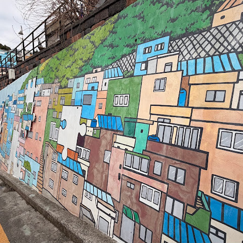사람들은 감천문화마을을 언덕을 따라 늘어선 알록달록한 집들 때문에 "한국의 산토리니"라고 부르곤 하는데, 그 말이 딱 맞습니다. 아기자기하고 사진 찍기 좋은 곳이지만, 관광객이 정말 많아요. 비수기에 갔는데도 생각보다 사람이 많았습니다.