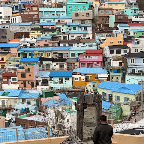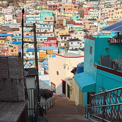 사람들은 감천문화마을을 언덕을 따라 늘어선 알록달록한 집들 때문에 "한국의 산토리니"라고 부르곤 하는데, 그 말이 딱 맞습니다. 아기자기하고 사진 찍기 좋은 곳이지만, 관광객이 정말 많아요. 비수기인데도 불구하고 생각보다 사람이 많았습니다.