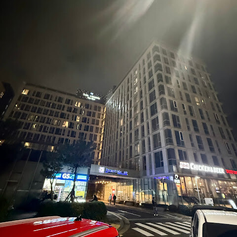 호텔 뒤편에는 흑돼지 전문점이 즐비한 거리가 있는데, 프런트 데스크 직원들은 대부분 중국인입니다. 길을 따라 10분도 채 걸리지 않는 곳에는 마트로(Martro) 슈퍼마켓과 그 옆에 로컬 푸드 노점이 있고, 길 건너편에는 BHC 치킨 체인점이 있습니다.