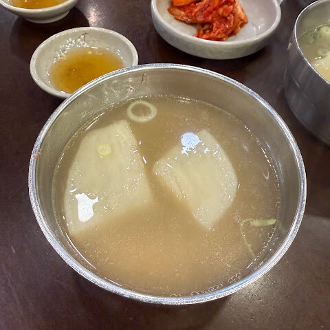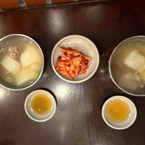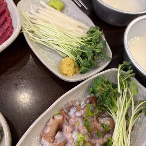 날것 그대로의 소고기와 문어는 제게 처음 접하는 독특한 음식이었지만, 가장 좋았던 건 그가 내준 수프였어요. 가장 만족스러웠던 건 그가 먼저 리필해 줄지 물어봐 준 거였고, 리필해 준 수프에는 무와 소고기 덩어리가 들어 있었어요. 웨이터의 서비스가 정말 훌륭했습니다!