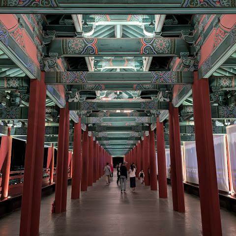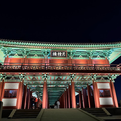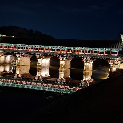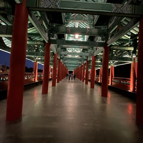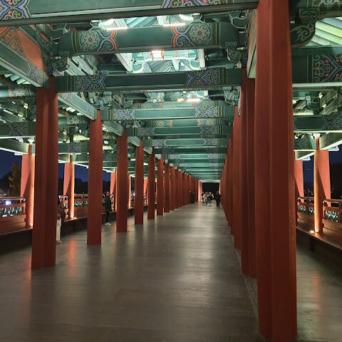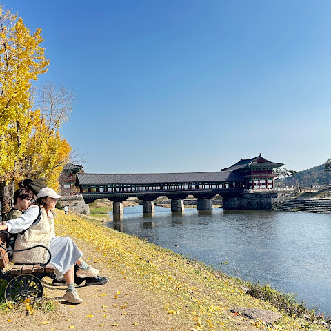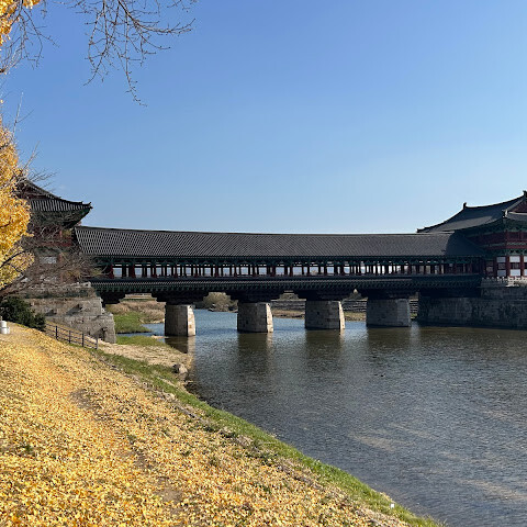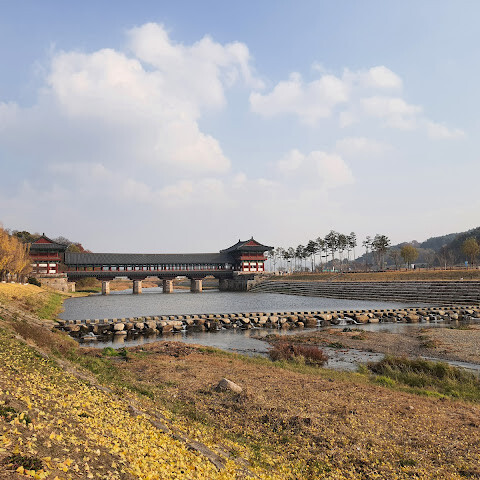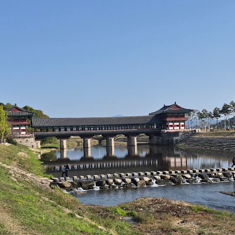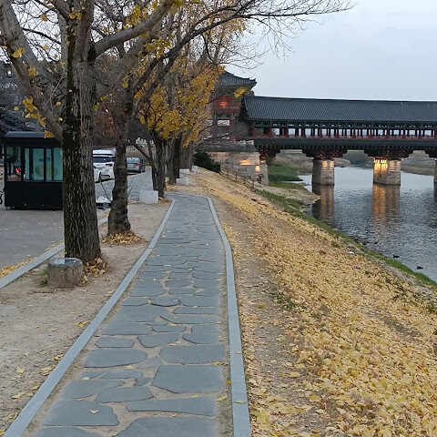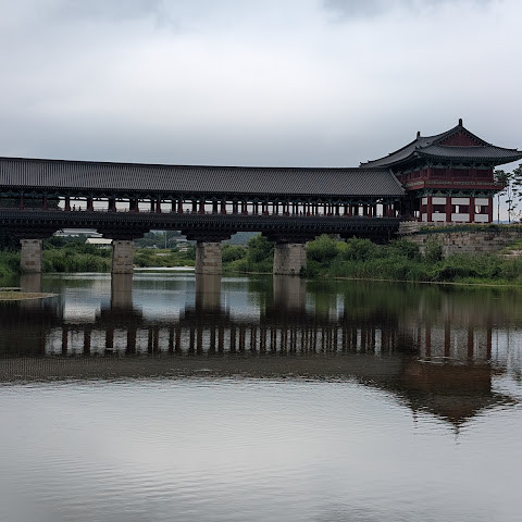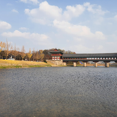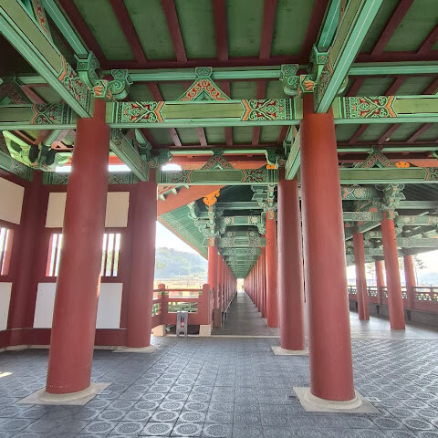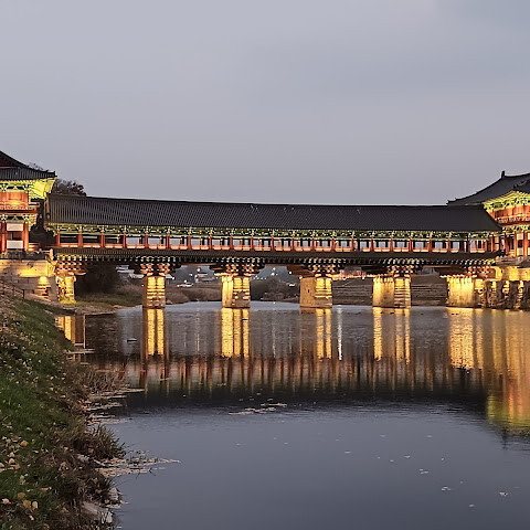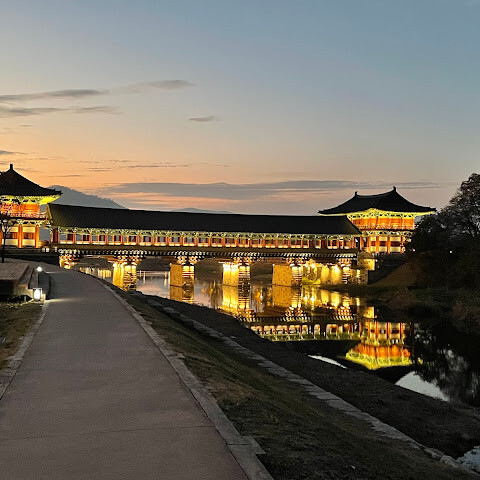 한국에서 가장 큰 목조 다리입니다. 아름다운 경치를 자랑하지만, 특히 밤에 방문하면 조명이 다리의 분위기를 완전히 바꿔주기 때문에 더욱 좋습니다.