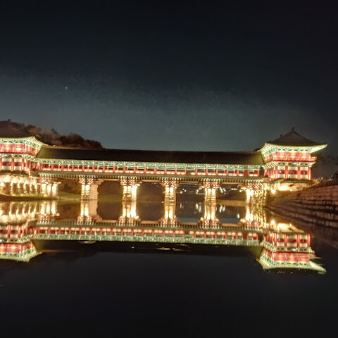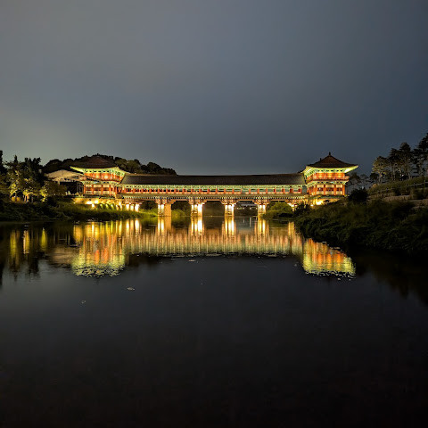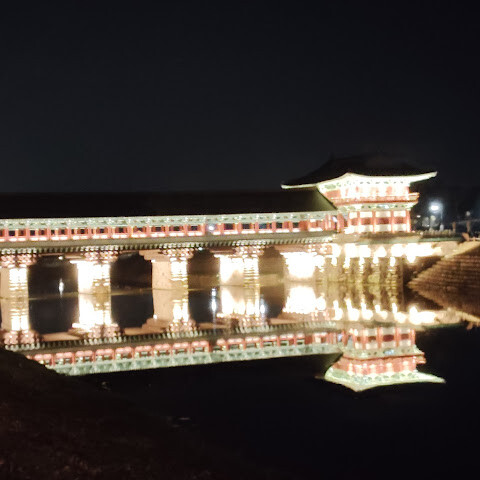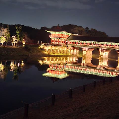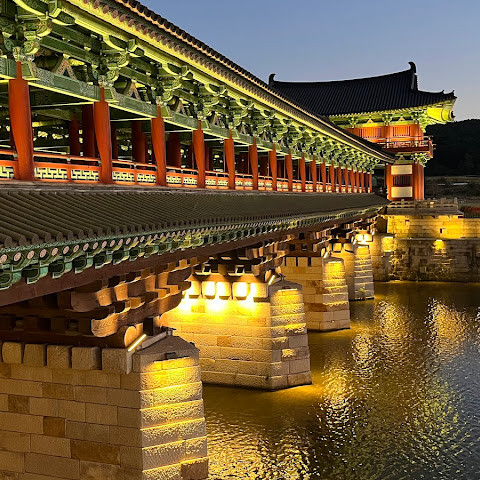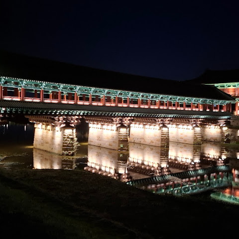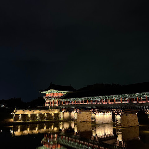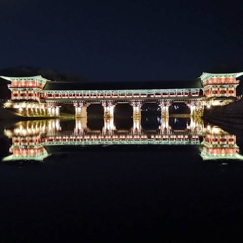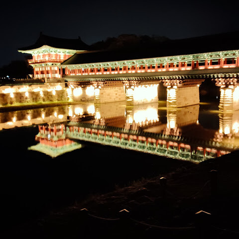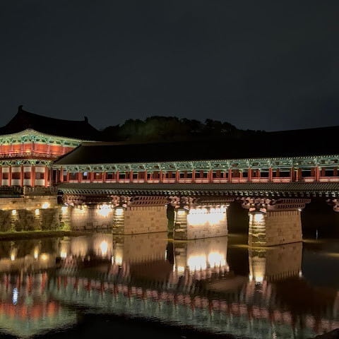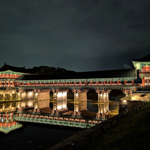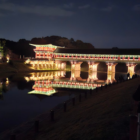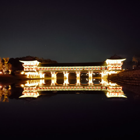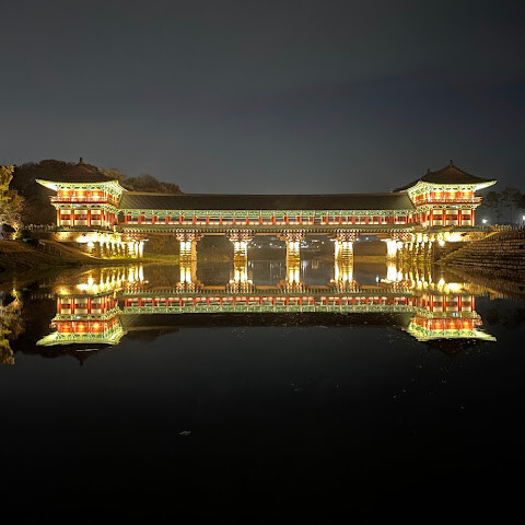 경주에 있는 이 훌륭하게 복원된 목조 다리는 아름다운 야간 조명과 완벽한 수면 반사로 유명합니다. 다리 위의 정자는 아름답게 조명되며, 한복을 입은 연주자들이 전통 음악을 라이브로 선보이는 경우가 많습니다.