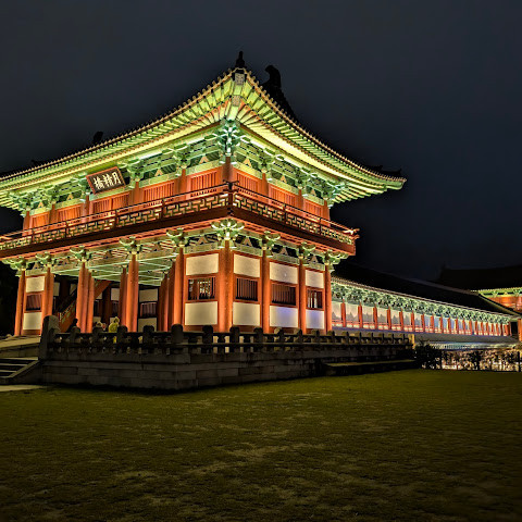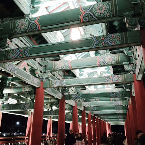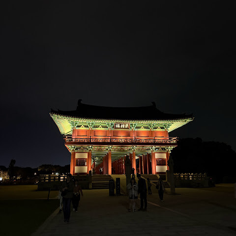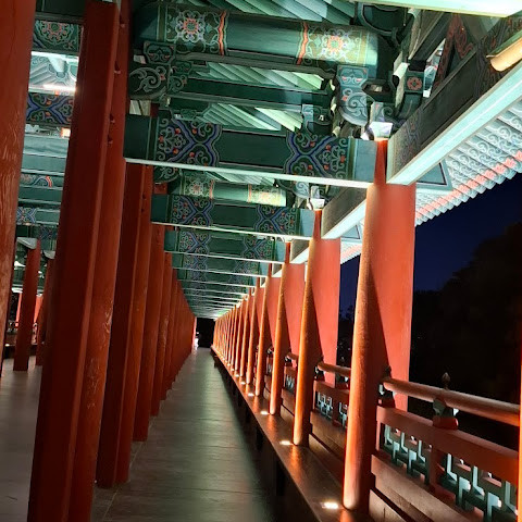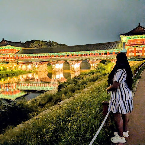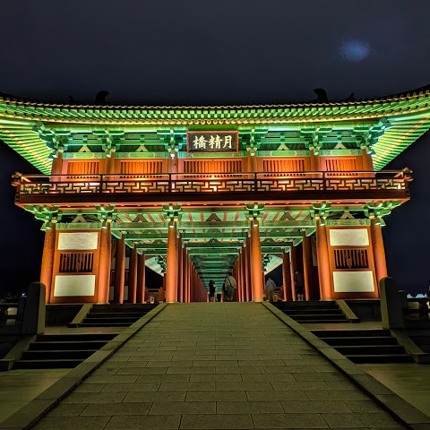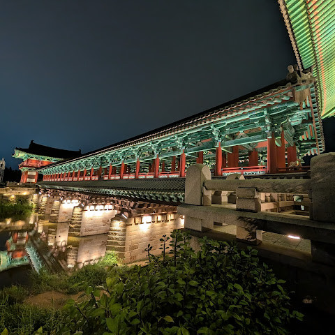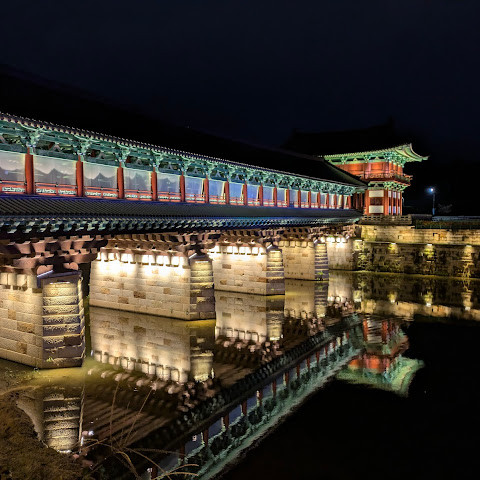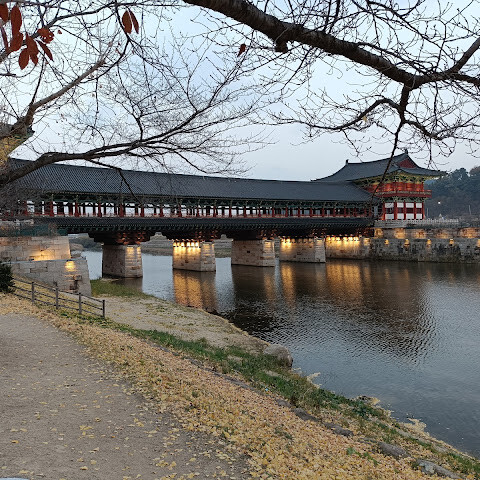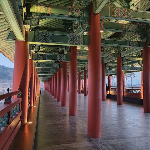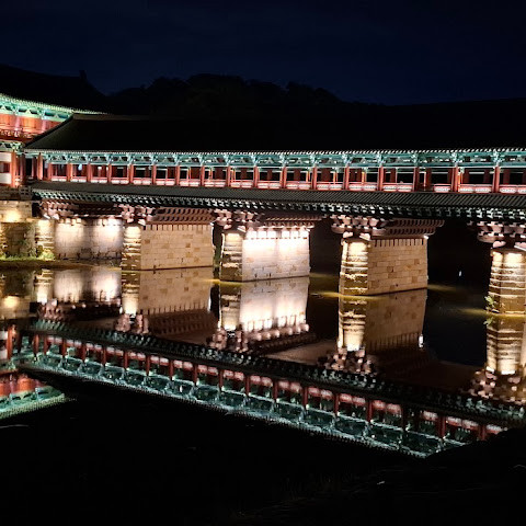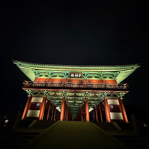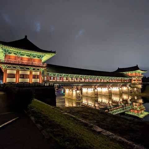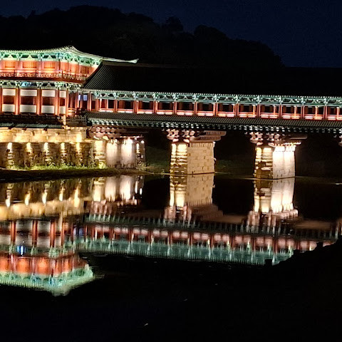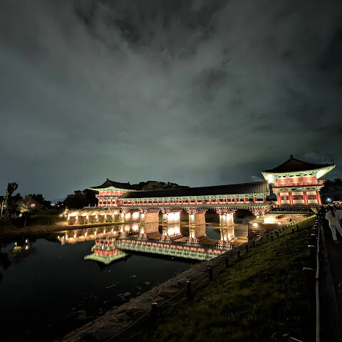 경주에 있는 이 훌륭하게 복원된 목조 다리는 아름다운 야간 조명과 완벽한 수면 반사로 유명합니다. 다리 위의 정자는 아름답게 조명되며, 한복을 입은 연주자들이 전통 음악을 라이브로 선보이는 경우가 많습니다.