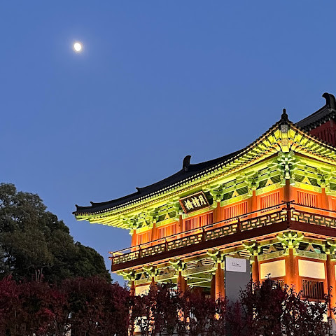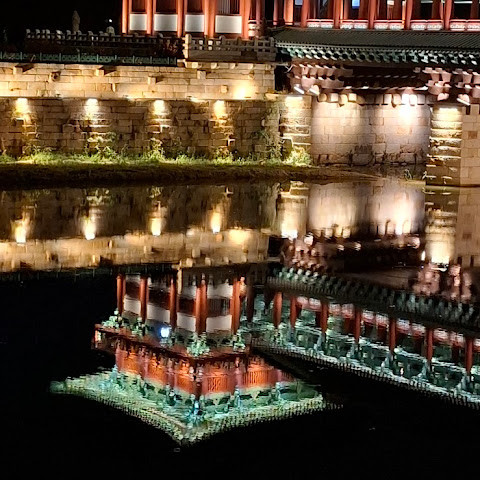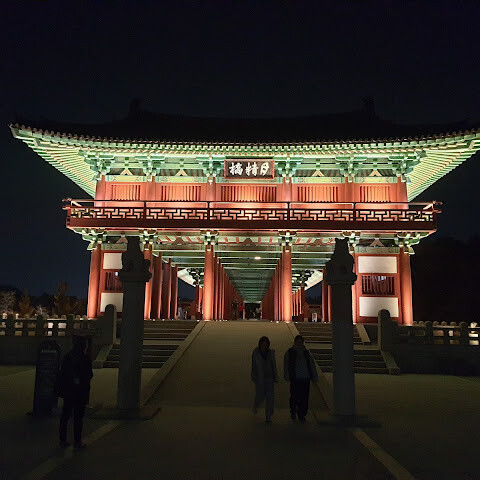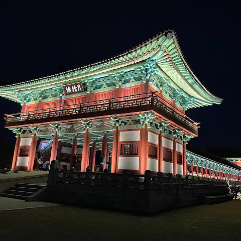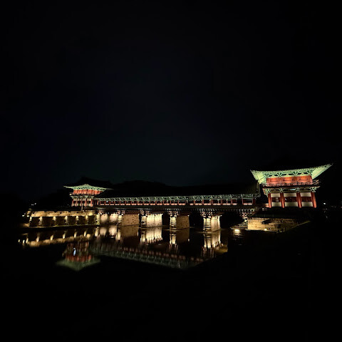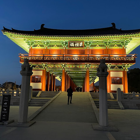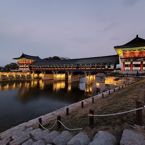 경주에 있는 이 훌륭하게 복원된 목조 다리는 아름다운 야간 조명과 완벽한 수면 반사로 유명합니다. 다리 위의 정자는 아름답게 조명되며, 한복을 입은 연주자들이 라이브 전통 음악을 선보입니다.