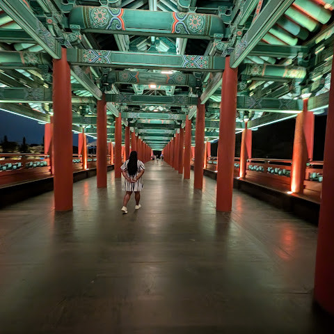 월정교는 아름답고 숨 막힐 듯 아름다운, 정말 고요한 풍경이에요. 다리 자체도 잘 보존되어 있고, 드라마에서 많이 봤던 그 공간을 걸을 수 있어서 정말 영광이었어요. 낮에 보는 월정교는 아름답지만, 진짜 마법은 해가 질 때 비로소 시작되죠!