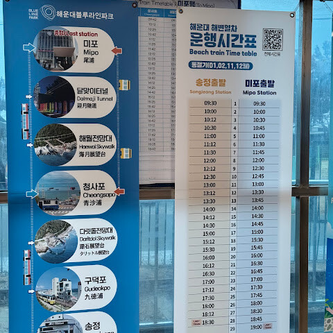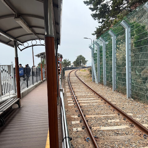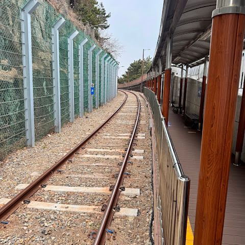 기차를 타야 해서 17시 12분 기차를 타기까지 10~15분밖에 시간이 없었어요. 서둘러 사진도 찍고, 주변을 산책하는 것도 꽤 신나는 경험이었어요. 아쉽게도 하늘이 원하는 만큼 파랗지는 않았지만, 다행히 미포역에 무사히 도착했답니다! 이 구간은 정말 스릴 넘쳤어요! 풍경도 아름다웠고요!