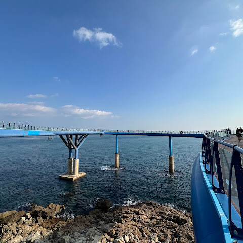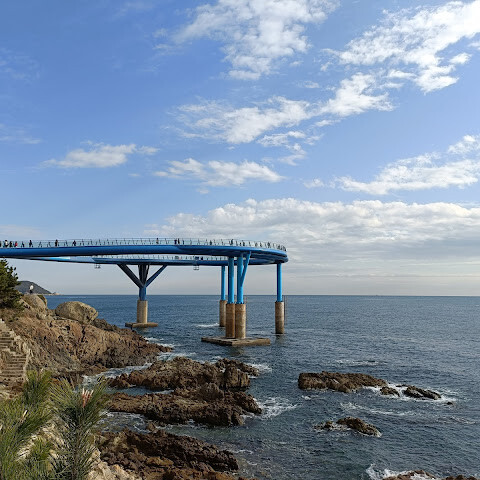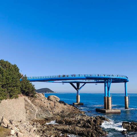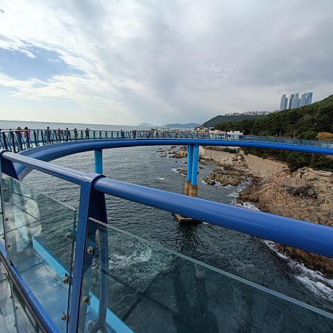 유리 바닥이 있는 아주 멋진 경치 좋은 다리입니다. 무료로 입장할 수 있고 해운대해수욕장 열차 다릿돌역에서 쉽게 갈 수 있습니다. 붐비지도 않고, 멋진 사진 찍기에도 좋습니다.