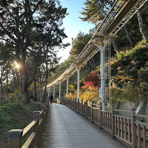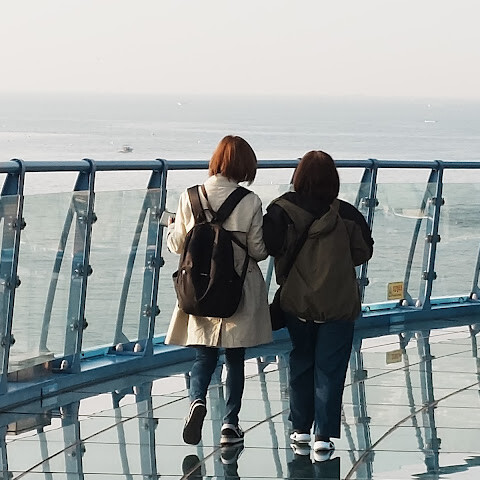 정말 멋진 (게다가 무료인) 스카이워크였어요. 부산에는 이런 스카이워크가 많은 것 같은데, 유리 위를 걸으면서 아래 깊숙한 곳까지 내려다볼 수 있었죠. 다행히 비가 오기 전에 잠깐 둘러볼 수 있었어요. 기차역도 있는데, 캡슐 터미널로 가는 편도 열차를 타려면 좀 더 걸어가야 해요.