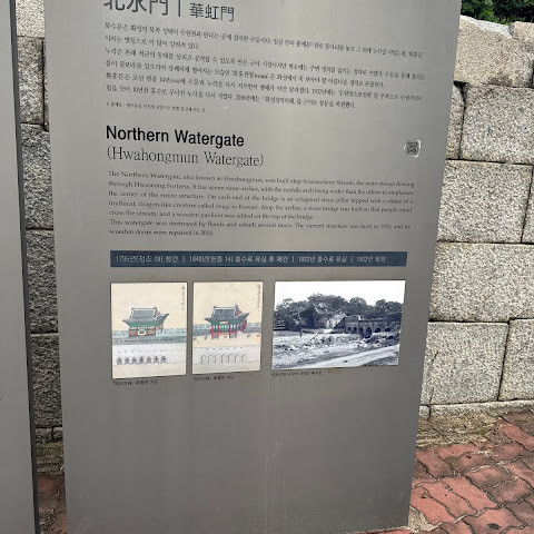 북수문은 화성 북쪽 성벽과 수원강이 만나는 지점에 위치해 있다. 일곱 개의 아치형 통로 위에 돌다리를 놓았고, 그 위에 누각을 세웠습니다. 일반적으로 "화홍문"으로 알려져 있습니다.