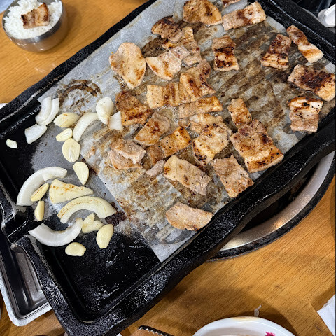 원래 한국식 바비큐를 먹으러 왔는데, 대만에서 먹어본 것과는 꽤 달랐어요. 냄비에는 소고기와 파가 듬뿍 올려져 있었고, 육즙이 국물에 잘 배어 있었어요. 해물파전과 중간 크기의 족발도 시켰어요. 손님들 사이에서 중국어를 쓰는 사람들도 몇몇 들렸어요.