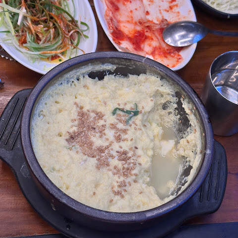 웨이터가 손님이 남긴 야채를 다시 씻어서 다음 테이블에서 우리에게 주는 것을 보았습니다. 김치와 상추가 떨어지면 무료로 리필할 수 있습니다. 1번 정식 32,000 + 만두국 8,000 + 비빔밥 9,000