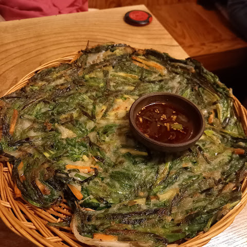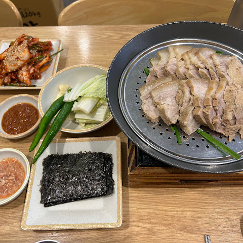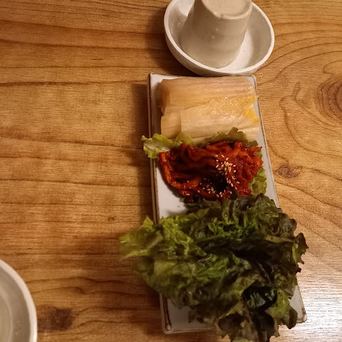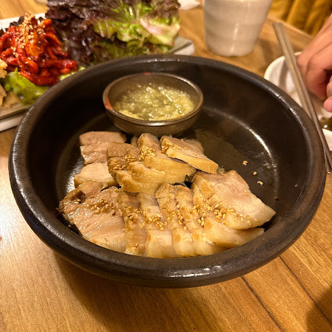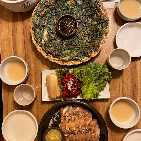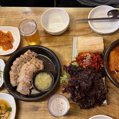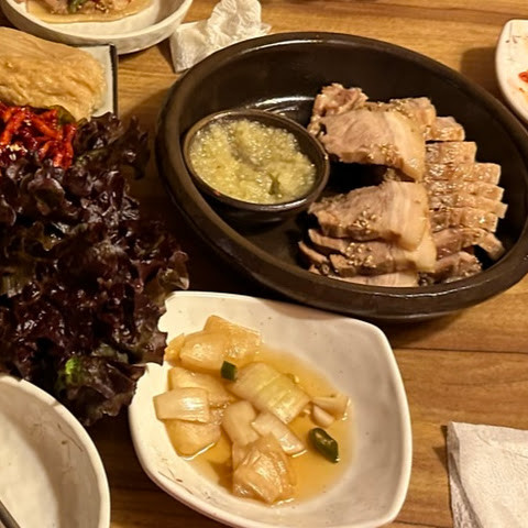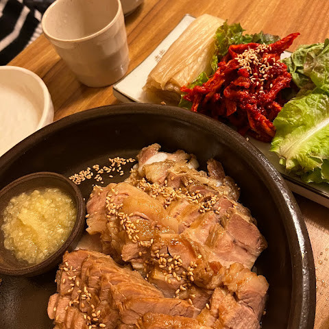 보쌈을 먹기에 정말 좋은 곳이었습니다. 보쌈이 너무 부드럽고 깔끔한 맛이어서 미국에도 이런 보쌈이 있었으면 좋았을 텐데요. 마늘 소스는 고기에 딱 맞는 딥 소스였고, 파전과 함께 막걸리를 주문해야 했습니다. 재료가 신선해서 배가 너무 부르거나 속이 더부룩하지 않은 정말 훌륭하고 맛있는 식사였습니다.
