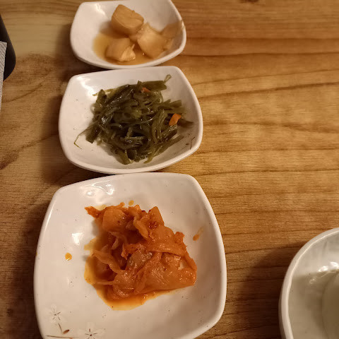 오후 12시부터 오후 2시까지는 1인당 13,000 TWR에 미역국, 밥, 보쌈이 포함된 일일 메뉴가 있습니다. 보쌈은 마늘잼을 곁들인 돼지고기 조림 요리입니다. 상추, 김치를 포함한 다양한 배추 장아찌, 그리고 다른 장아찌와 함께 먹습니다. 한국처럼 찬물도 제공됩니다.