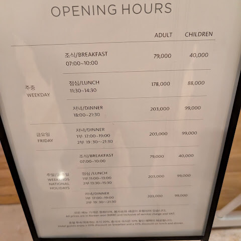 영업시간 평일-아침 06:00-10:00 / 점심 11:30-14:30 / 저녁 18:00-22:00 주말- 아침 06:00-10:00 / 점심1부 11:30-13:30 / 점심2부 14:00-16:00 / 저녁1부 17:30-19:30 / 저녁2부 20:00-22:00