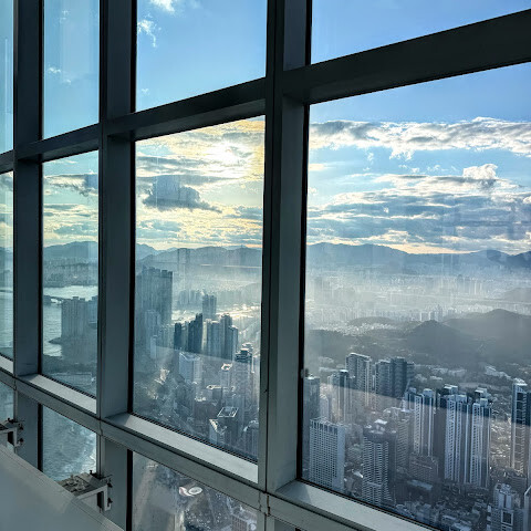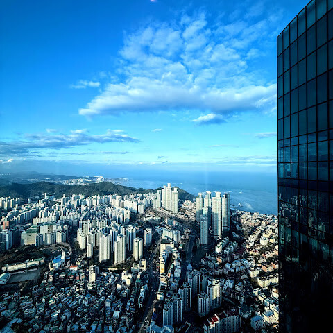 저희는 패스를 이용해서 여기까지 올라왔어요. 밤에 드론 비행을 보고 싶었는데, 여기서는 낮에만 경치를 볼 수 있더라고요. 그래도 낮에도 정말 아름다웠어요. 고층 건물들이 마치 비현실처럼 보였고, 모든 게 초현실적으로 느껴졌어요. 해안 관광이 이렇게 잘 발달한 게 정말 놀라웠어요. 시설도 훌륭했고요. 제일 높은 건물에는 스타벅스가 있더라고요. 100층에 올라간 후에는 해안 열차를 탔어요. 사람이 정말 많아서 모든 걸 다 볼 수는 없었어요. 여러 번 와야 다 볼 수 있을 것 같아요. 해운대 해변과 해안선, 그리고 새로 지어진 건물들을 감상하기에 정말 좋은 곳이에요!