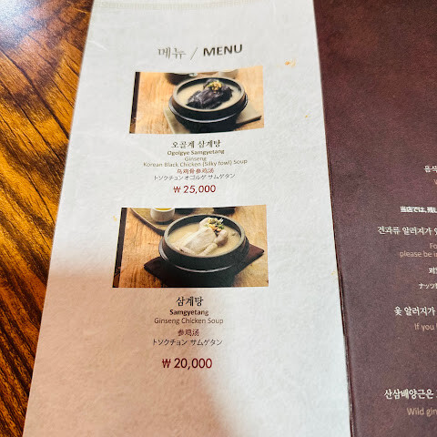 아늑한 전통 방들과 아름다운 안뜰이 있는 멋진 인테리어의 식당입니다. 특히 인삼 닭고기탕이 일품입니다. 국물은 약초 향이 강하지 않으면서도 진하고 걸쭉한 맛이 일품입니다. 닭고기 안에는 찹쌀이 들어있습니다. 1인분에 1인분씩 주문하는 것을 추천하는데, 양이 넉넉해서 좋습니다.