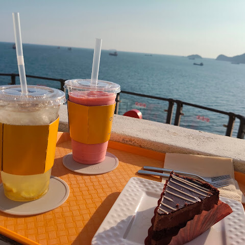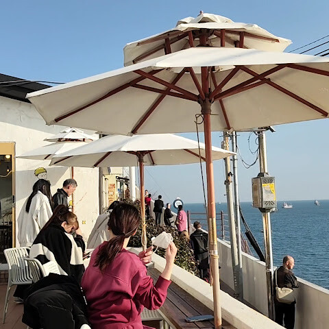근처 카페들이 괜찮아요. 커피와 케이크를 먹으며 바다를 바라보는 건 정말 편안한 시간이에요.