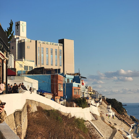 부산 영도에 위치한 문화마을입니다. 중앙대로에서 508번 버스를 타세요. 사자공원 정류장에서 내리시는 것을 추천합니다. 사자공원 전망대에서는 아름다운 도시 전경을 감상할 수 있습니다. 시내 방향으로 돌아오시면 언덕 위에 자리 잡은 다채로운 상점과 식당들이 즐비한 문화마을이 나옵니다. 사자공원 전망대에는 부산의 상징인 통통한 갈매기 부기가 있는데, 내려가기 전에 작은 백련사를 방문할 수 있습니다. 백련사에서 계단을 내려가면 물가에 작은 카페와 상점들이 늘어서 있습니다. 저희가 방문했을 때는 물가 터널이 공사 중이라 폐쇄되어 있었습니다. 끝에는 두 개의 아름다운 사찰로 올라갈 수 있는 갈림길이 있습니다.