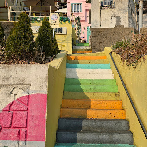 개인적으로 부산 문화마을 중에서 가장 마음에 드는 곳이에요. 언덕 위층에는 카페와 아기자기한 가게들이 있고, 바닷가 쪽으로 가면 작은 터널도 있어요. 맑은 날에 가면 멋진 경치를 감상할 수 있어서 좋아요.