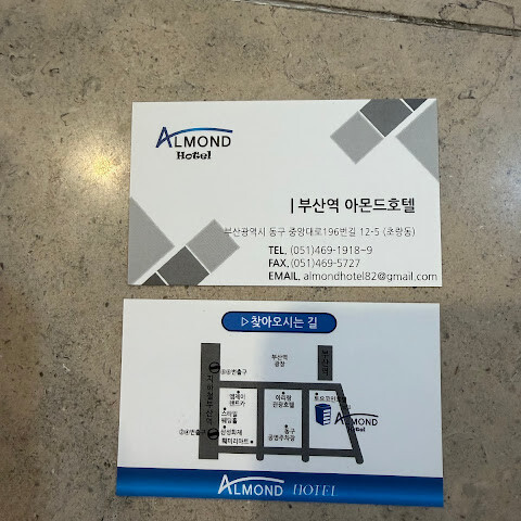 아몬드호텔은 부산역에서 도보 5분 이내 거리, 부산항 국제여객터미널과도 1km 거리에 자리한 호텔로, 대중교통이 편리해 출장객의 선호도가 높다. 객실은 온돌형과 침실형으로 나뉘는데, 전반적으로 넓고 프리미엄 패밀리의 일부 객실을 제외하면 모든 방에 너른 욕조가 딸려 있다. 복사, 인쇄, 팩스 대행 및 짐 보관 서비스를 제공한다. 인근에 초량이바구길, 용두산공원, 보수동 책방골목, 자갈치시장 등 주요 관광지가 있다.