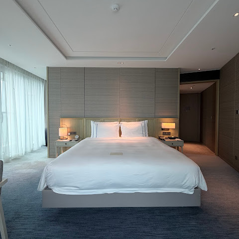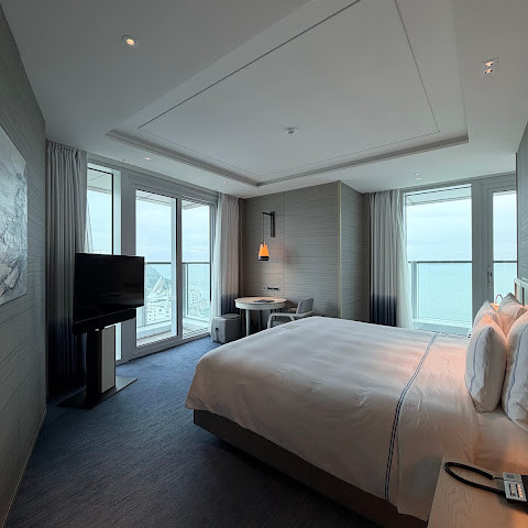 3박 숙박의 1/3이 지났는데, 벌써 이 호텔이 최고급 럭셔리 호텔이라는 것을 알 수 있습니다. 오후 1시 45분에 도착해서 붐비는 로비에 도착했지만, 아주 체계적인 체크인 시스템을 통해 짐을 맡아주고 편안한 좌석으로 안내해 주어서 기다리지 않아도 되었습니다. 객실은 흠잡을 데 없이 깔끔하게 꾸며져 있었고 바다 전망이 보이는 꽤 넓은 공간이었습니다. 뷰 라운지에 도착했는데, 사시미, 맛있는 고기, 샐러드 등 풍성한 뷔페가 정말 훌륭했습니다. 어젯밤에는 차오란 중식당에서 고급 저녁 식사를 했습니다. 침대가 너무 편안해서 9시간이나 잤습니다!