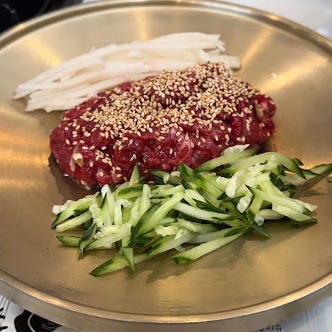 한우물회랑 떡갈비 먹으러 갔다가, 주변 분들이 매운 소갈비찜 많이 먹길래 따라서 주문했는데 굿 초이스 였네요~! 맵찔이 남편은 매워서 헉헉대면서도 잘 먹었고요~ 매운거 조금 잘 먹는 저는 고기 소스에 듬뿍 발라 열심히 먹었네요~ 한우 떡갈비는 소스랑 고기 조합이 넘나 좋아서 아들이 독차지 했네요 ㅎㅎ 매울때 먹어주면 맵단맵단 조합 굿이고요~ 처음 먹어본 한우육회는 맛있었지만,, 한여름이 아니라면 저희는 육회비빔밥이 더 맛있는것 같아요~! ㅎㅎ