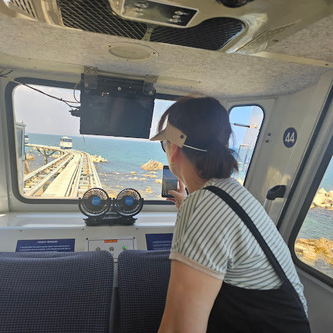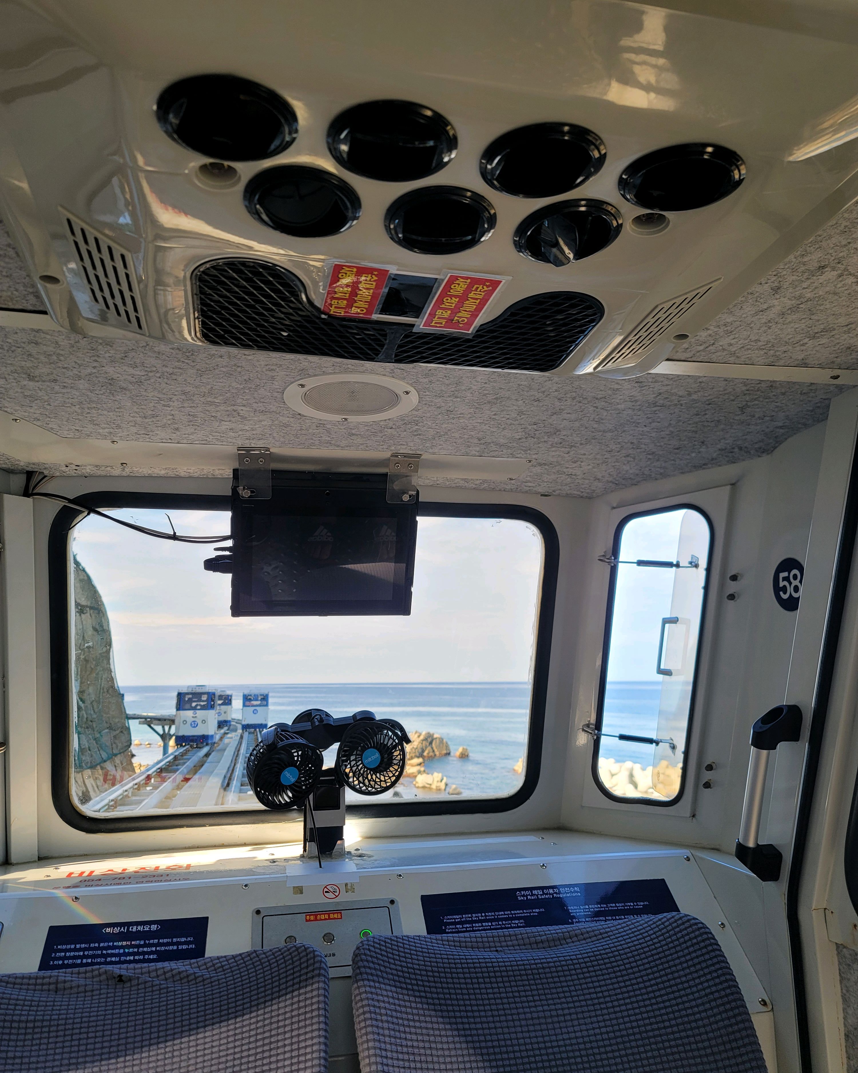 죽변해안스카이레일 안에는 에어컨은 없고 선풍기만 있어요. 우리가 간 날은 구름이 많고 바람이 불어 선풍기만으로도 시원했어요.
