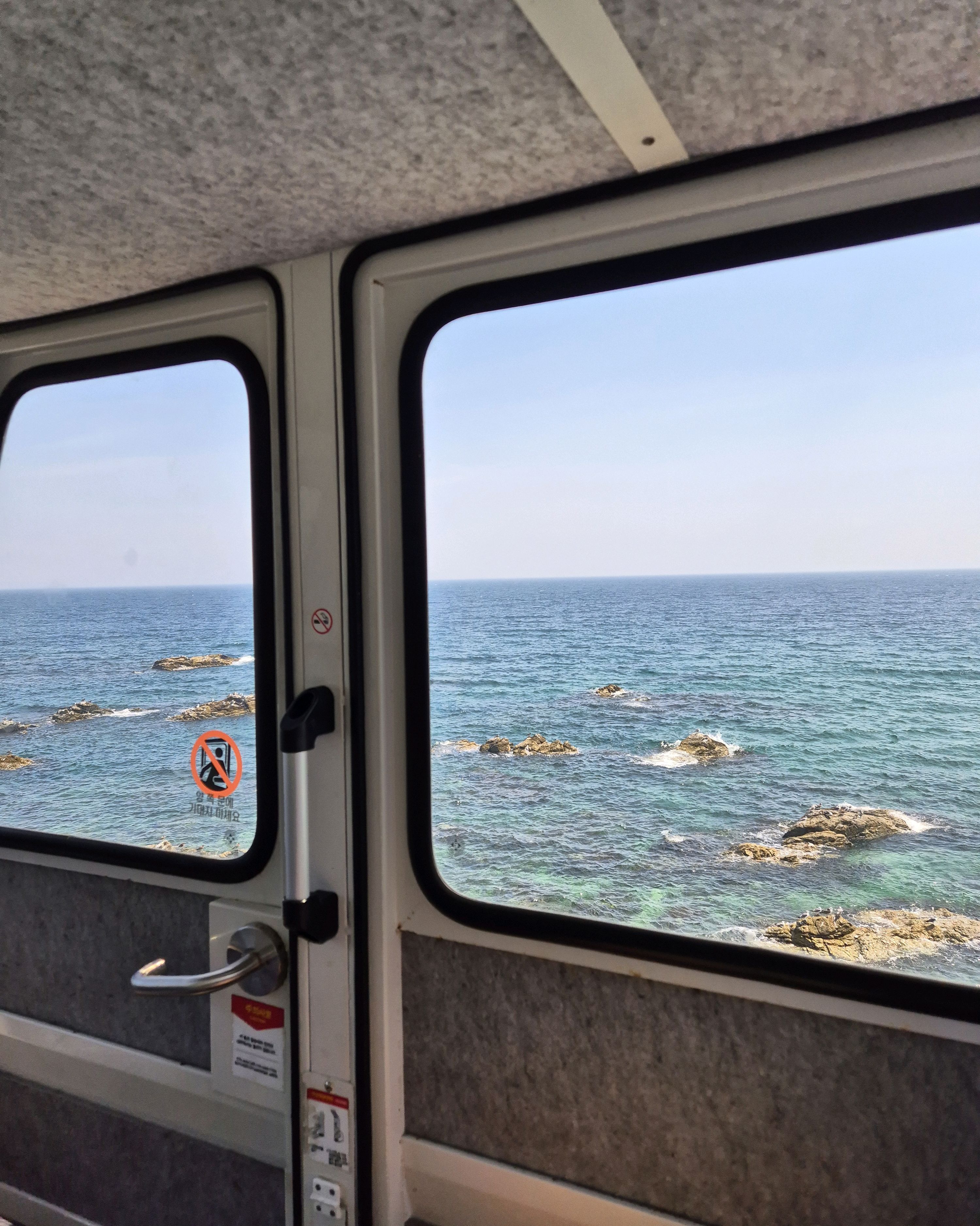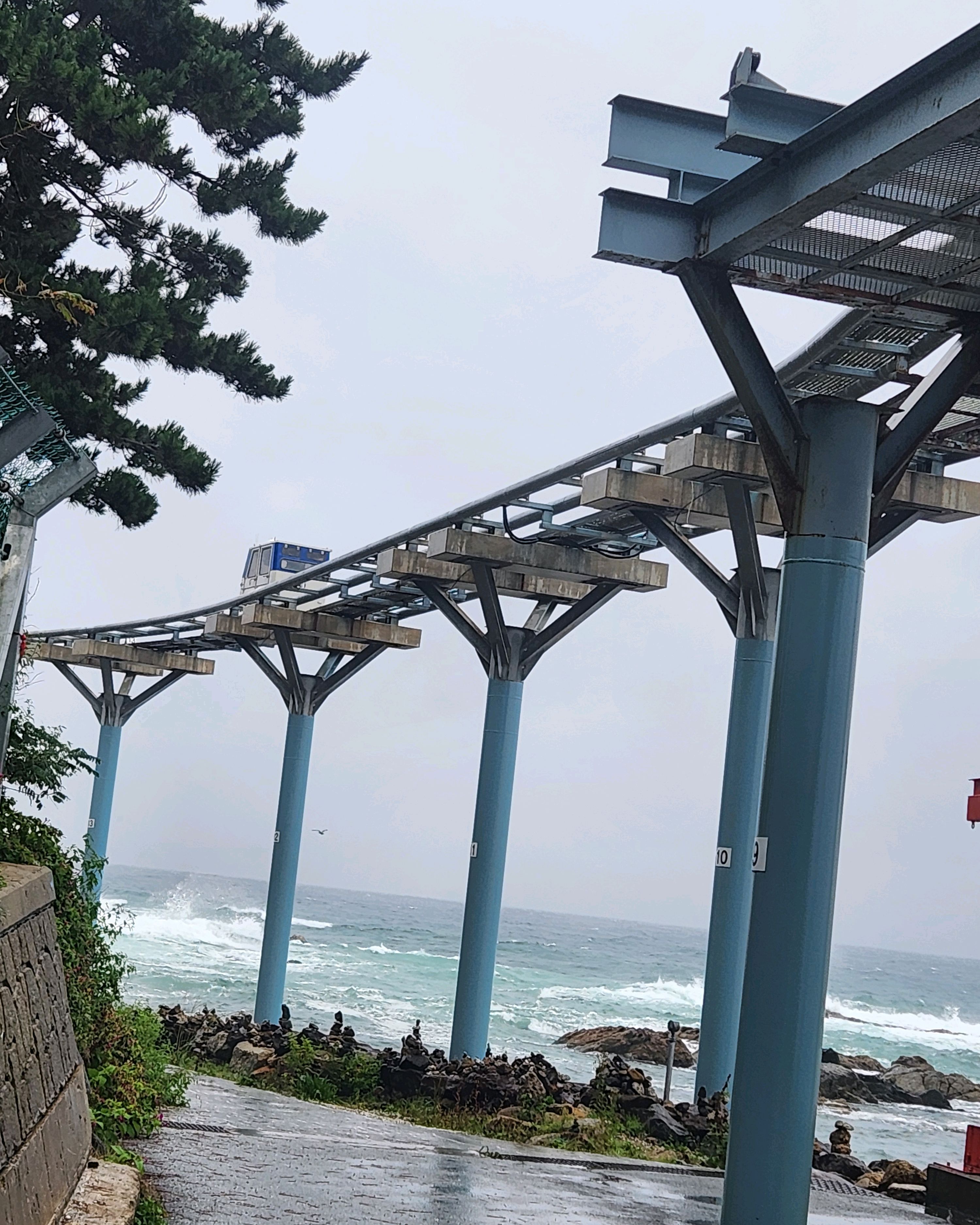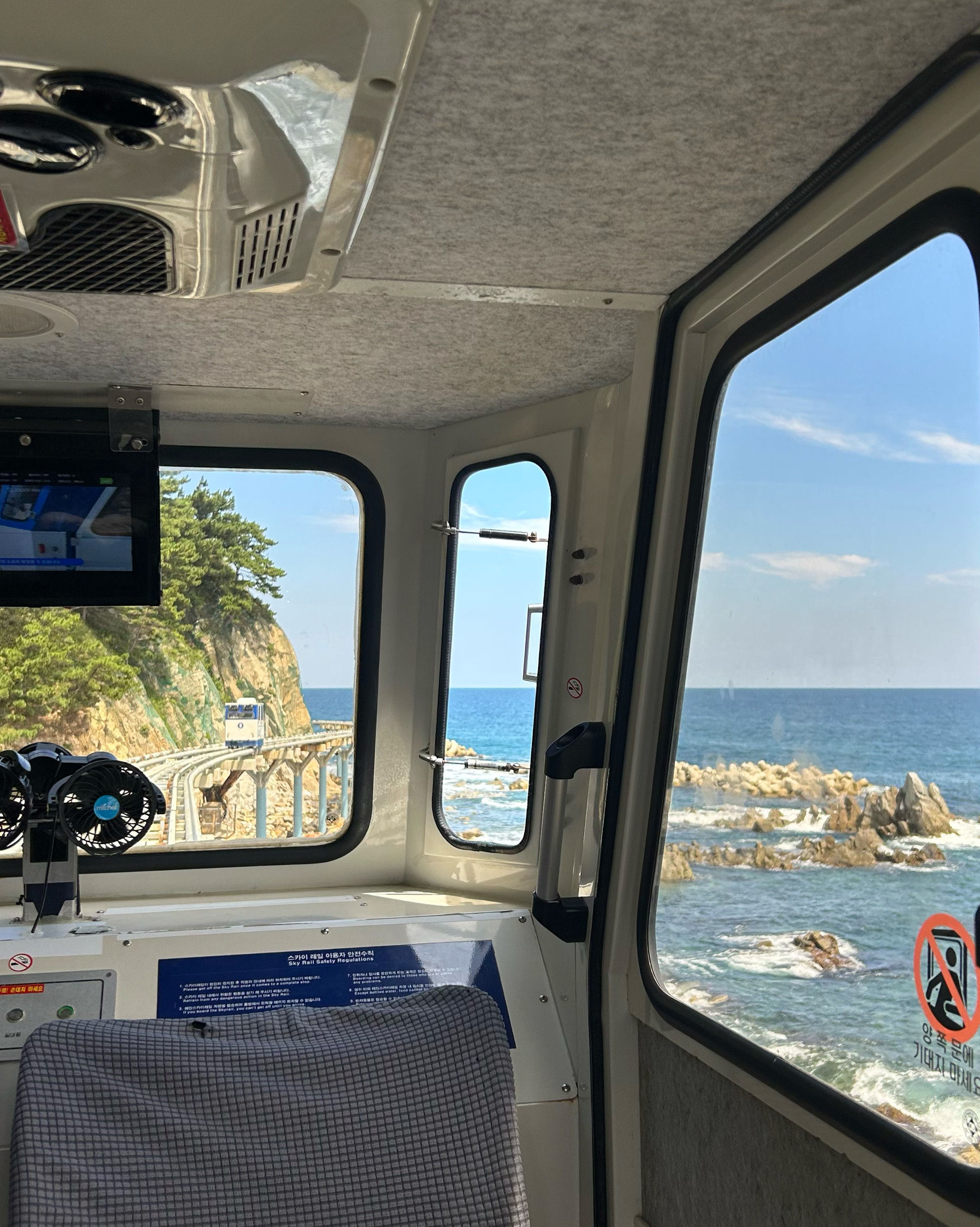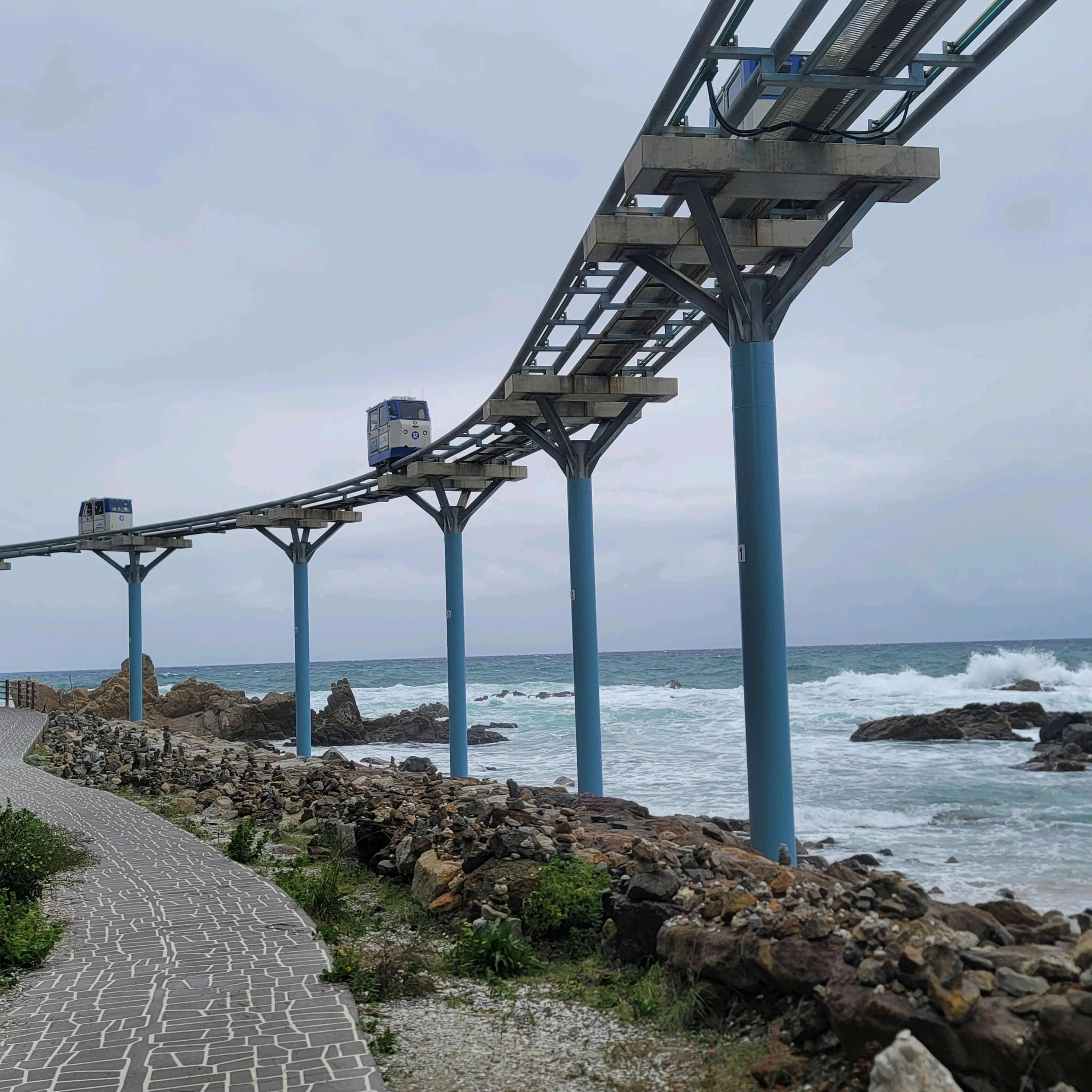 바다풍경은 너무 좋아요! 스카이레일 좌석이 차체자체에 쇼바가 없는거같은데 좀타다보면 엉덩이와 허리가 좀 아픕니다. 소음도 좀 있어서..바다낭만이 반감되요..
